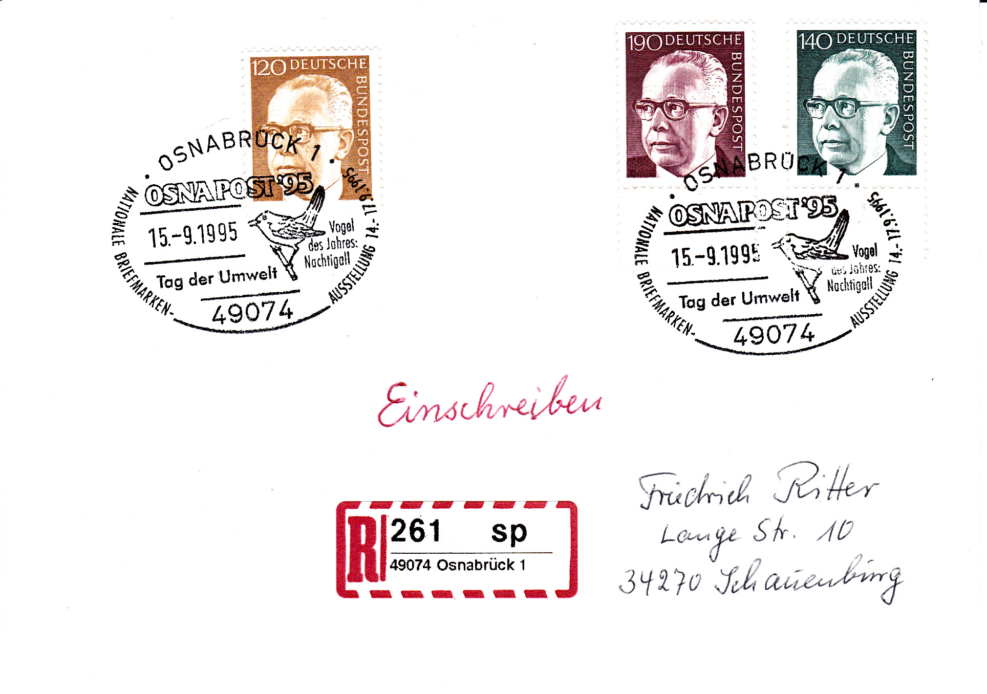 Sonderstempel aus Osnabrück mit der Abbildung einer Nachtigall.