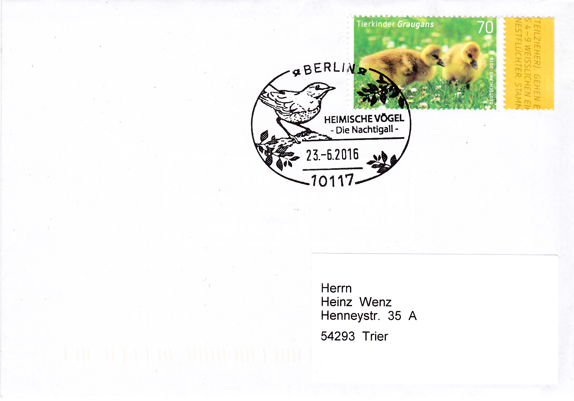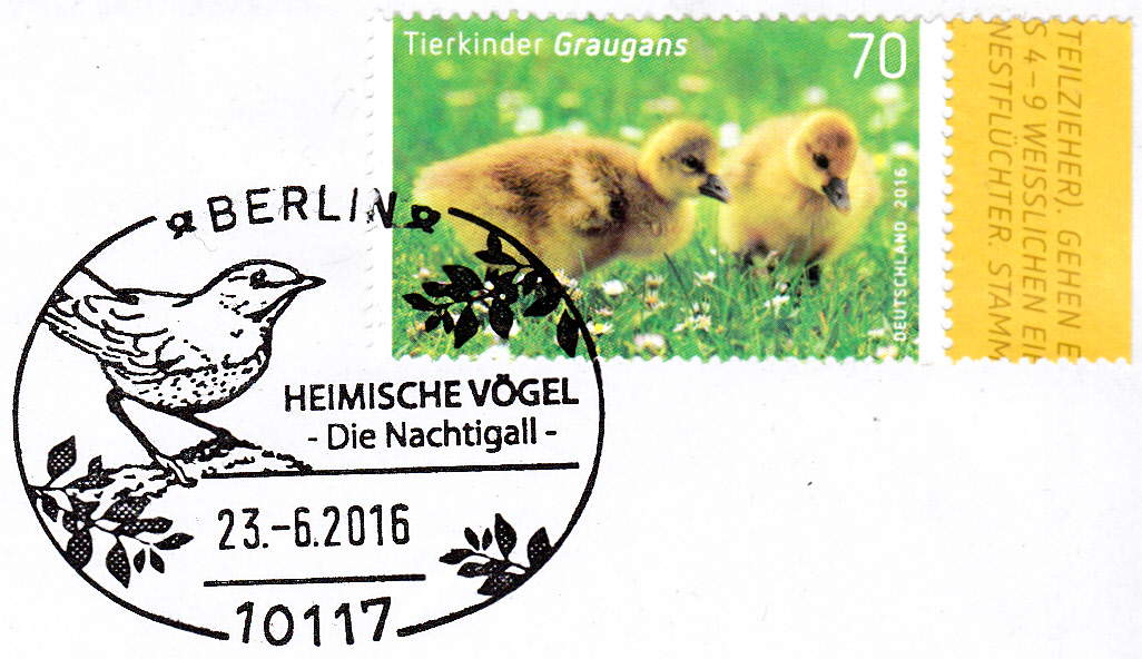 Am 23.6.2016 gab es diesen Sonderstempel in Berlin mit der Abbildung einer Nachtigall.