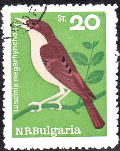 Die Nachtigall kommt auch als Motiv für Briefmarken vor, wie diese Marke aus Bulgarien (MiNr 1536) zeigt.