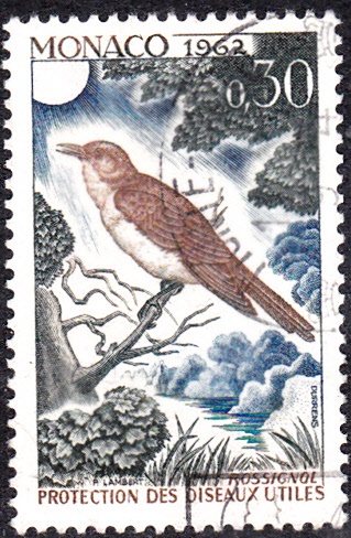 In einer Serie "Vogelschutz" erschien in Monaco diese Marke (MiNr 705) mit der Abbildung einer Nachtigall (Luscinia megarhynchos).