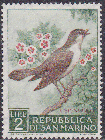 Diese Nachtigall (Luscinia megarhynchos) sitzt auf einem Zweig und ist am Singen. Es singen nur die Nachtigall-Männchen. Also muss es sich auf der Marke aus San Marino (MiNr 636) um Männchen handeln.