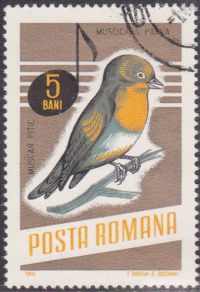 Aus einer Serie "Singvögel" stammt diese rumänische Marke (MiNr 2500) mit einem Zwergschnäpper (Ficedula parva).