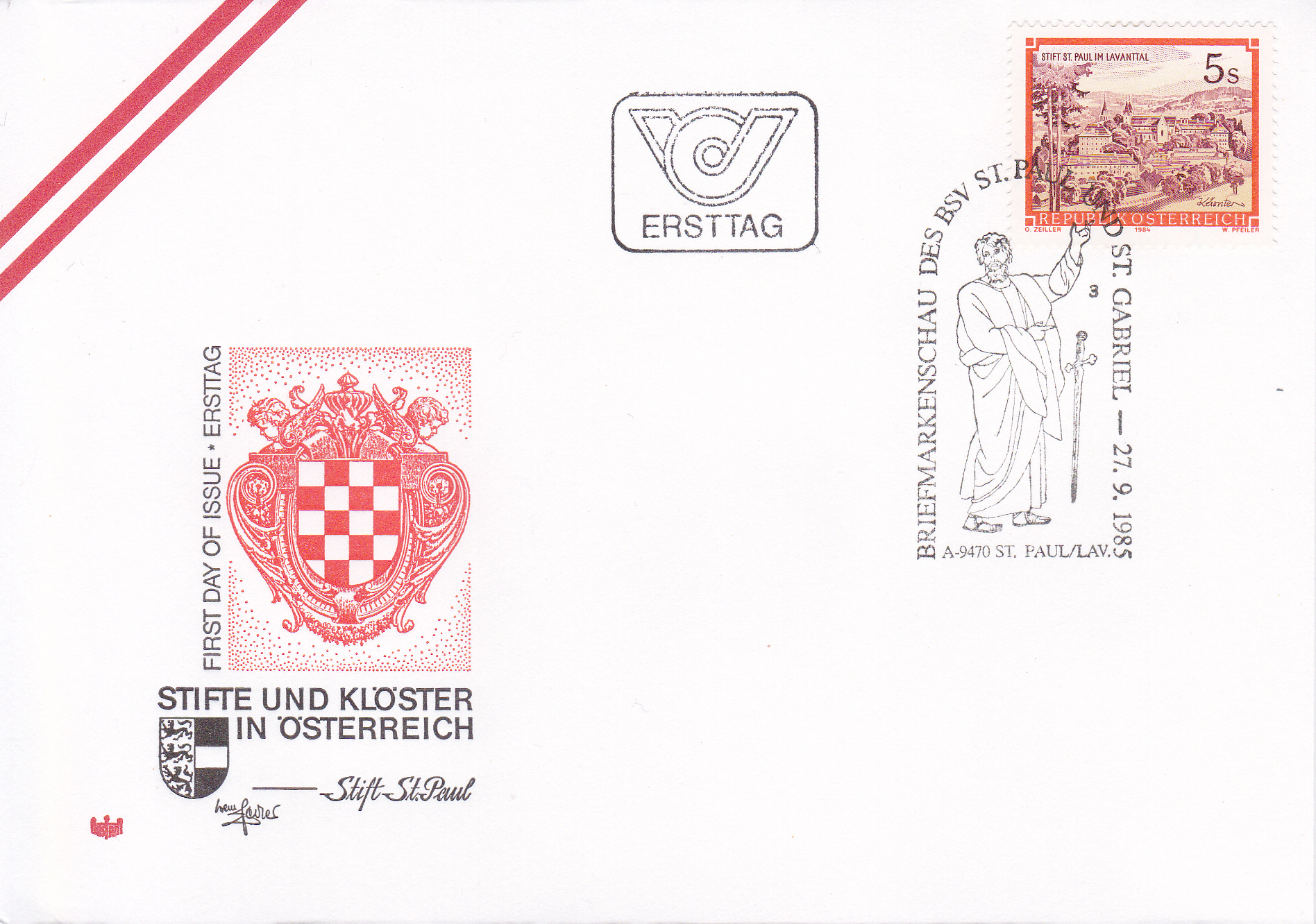 FDC mit dieser Marke einem zur Marke passenden Sonderstempel aus St. Paul im Lavanttal vom 27.9.1985 mit der Kennziffer "3".