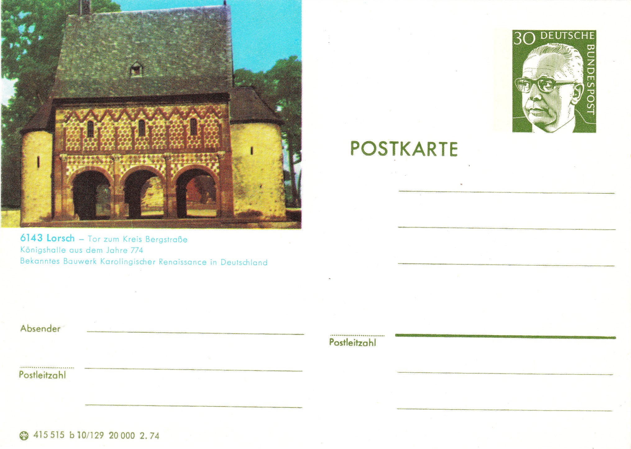 Zum Thema "1250 JAHRE KLOSTERC LORSCH" erschien 2014 diese Sondermarke, hier als selbstklebende Version mit 2 Cent Ergänzungsmarke auf Standardbrief zu 62 Cent im Jahre 2015: