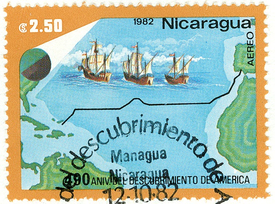 Anlässlich des 490. Jahrestages der Entdeckung Amerikas durch eine Kolumbus-Expedition gab die Post Nikaraguas mehrere Marken heraus. Unter anderem diese, auf der die 3 Schiffe dieser Expedition Teil des Markenbildes sind und die als MiNr. 2324 katalogisiert wurde.