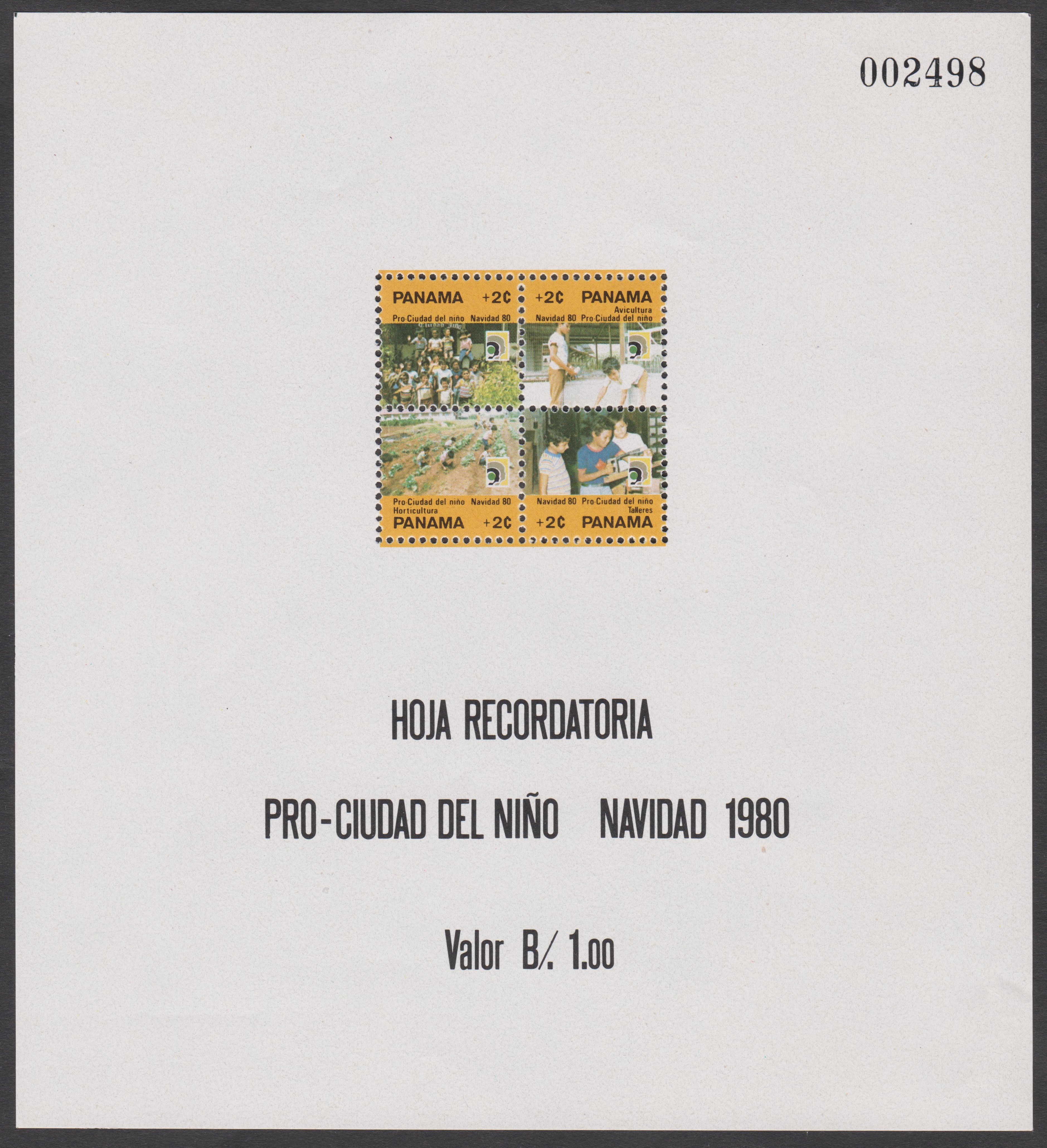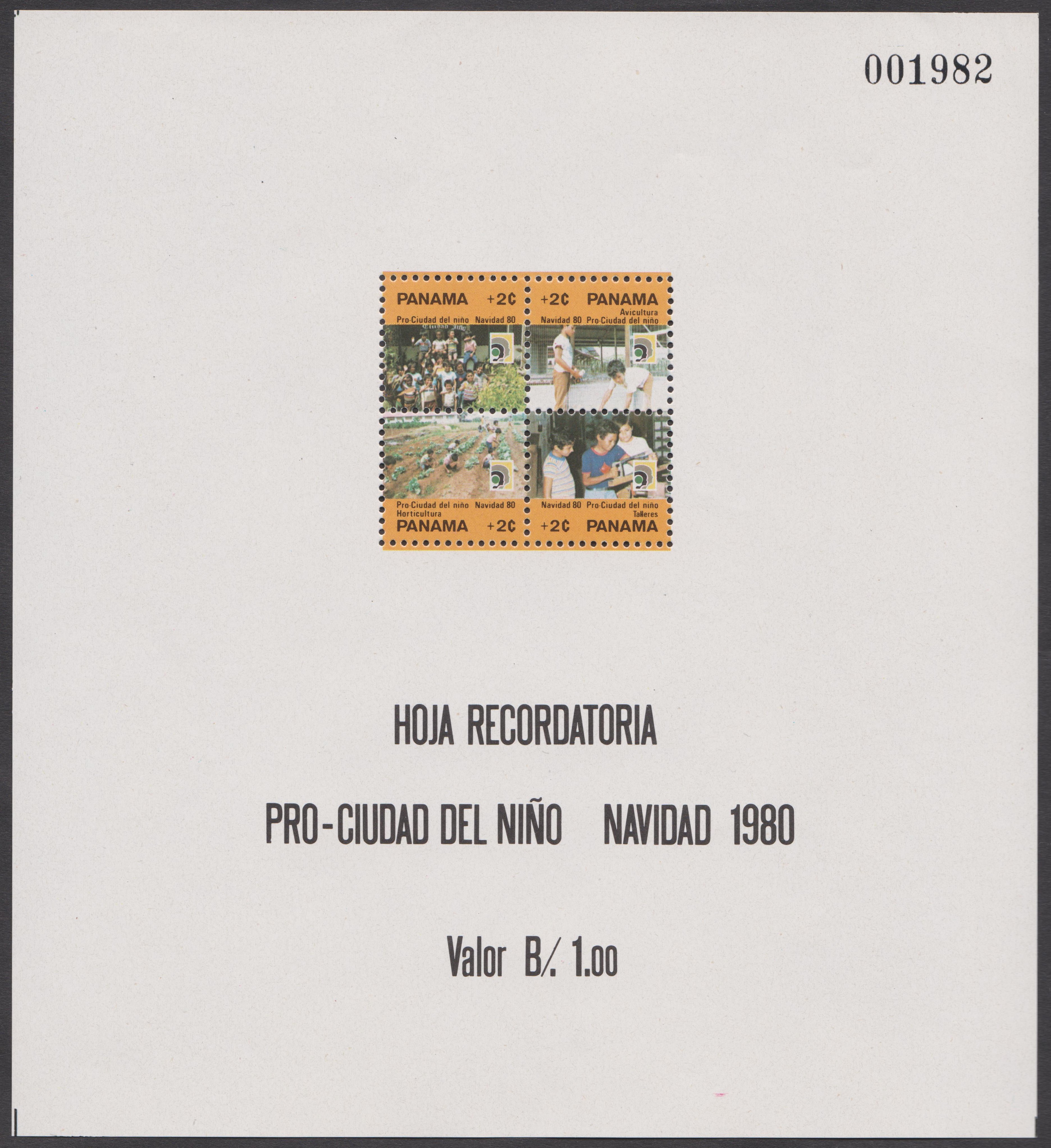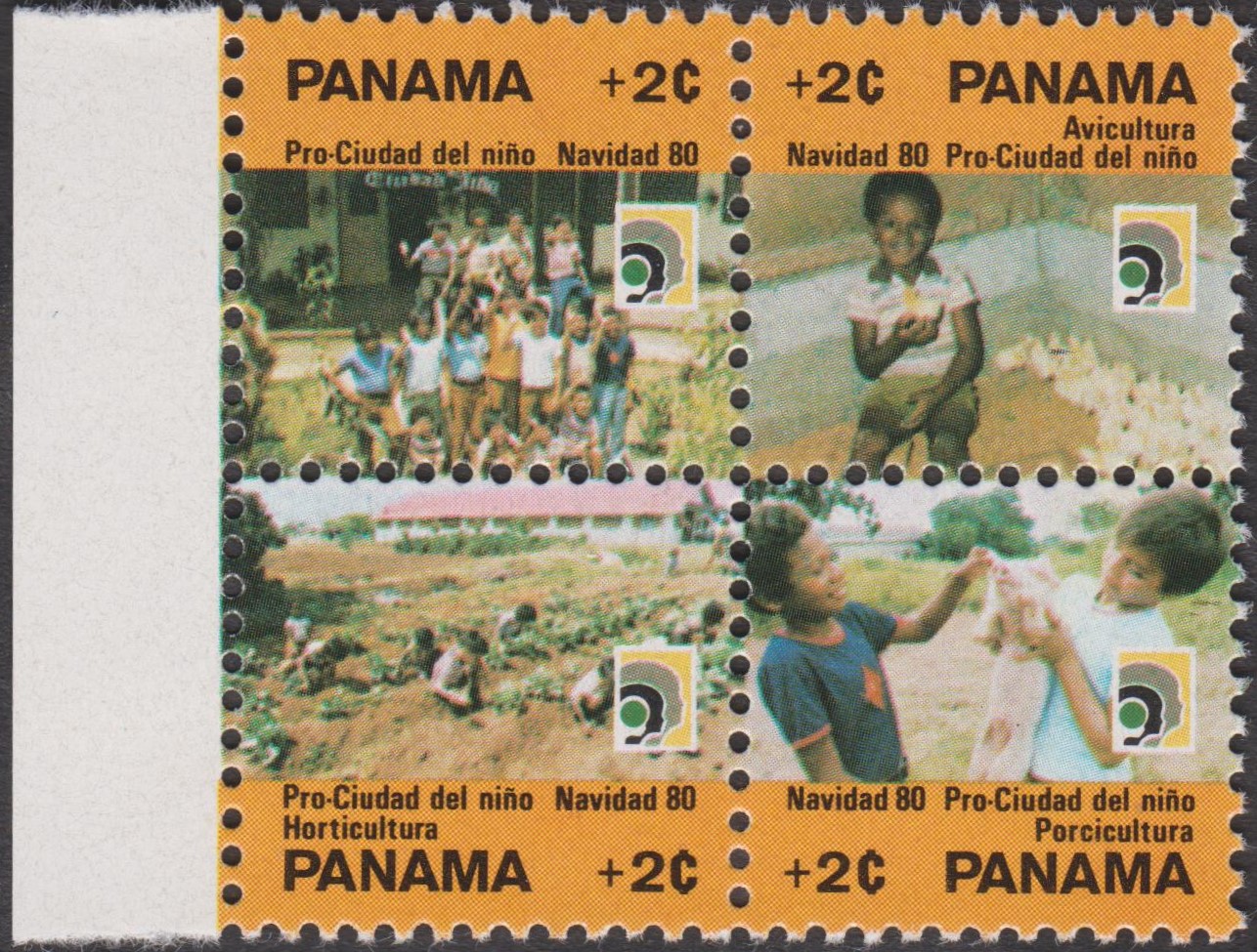 Die Zwangszuschlagsmarken Panama MiNr. 82-85 erschienen am 03.12.1980 zugunsten der Kinderstadt und wurden in Bogen zusammenhängend in Viererblockanordnung gedruckt.