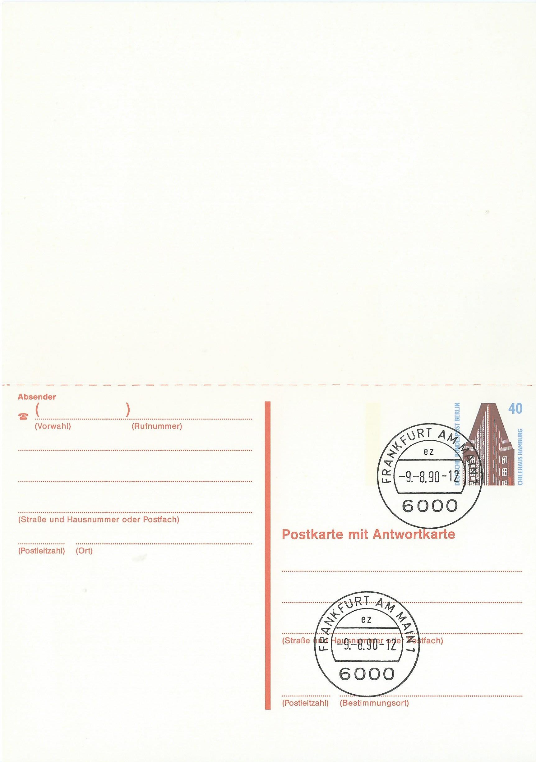 hier kann ich eine weitere Postkarte zu 40 Pf zeigen: Zuerst habe ich gedacht, es handelt sich um eine Privatganzsache, da links im Feld der Schmuckzudruck angebracht wurde. Aber bei genauerem Hinsehen erkennt man unter dem oberen Zudruck noch die Originalbedruckung „Absender“ und die entsprechenden Spalten. Also handelt es sich um einen privaten Zudruck, den sicherlich ein Händler veranlasst hat, um die Postkarte zu einem höheren Preis an seine Kundschaft zu verkaufen. Na ja, der Anlass ist ja auch Geschichte pur: 1. Juli 1990, Inkrafttreten der Währungs- Wirtschafts- und Sozialunion Bundesrepublik – DDR. Gestempelt wurde mit einem entsprechenden Sonderstempel in Berlin am 1.7.90: