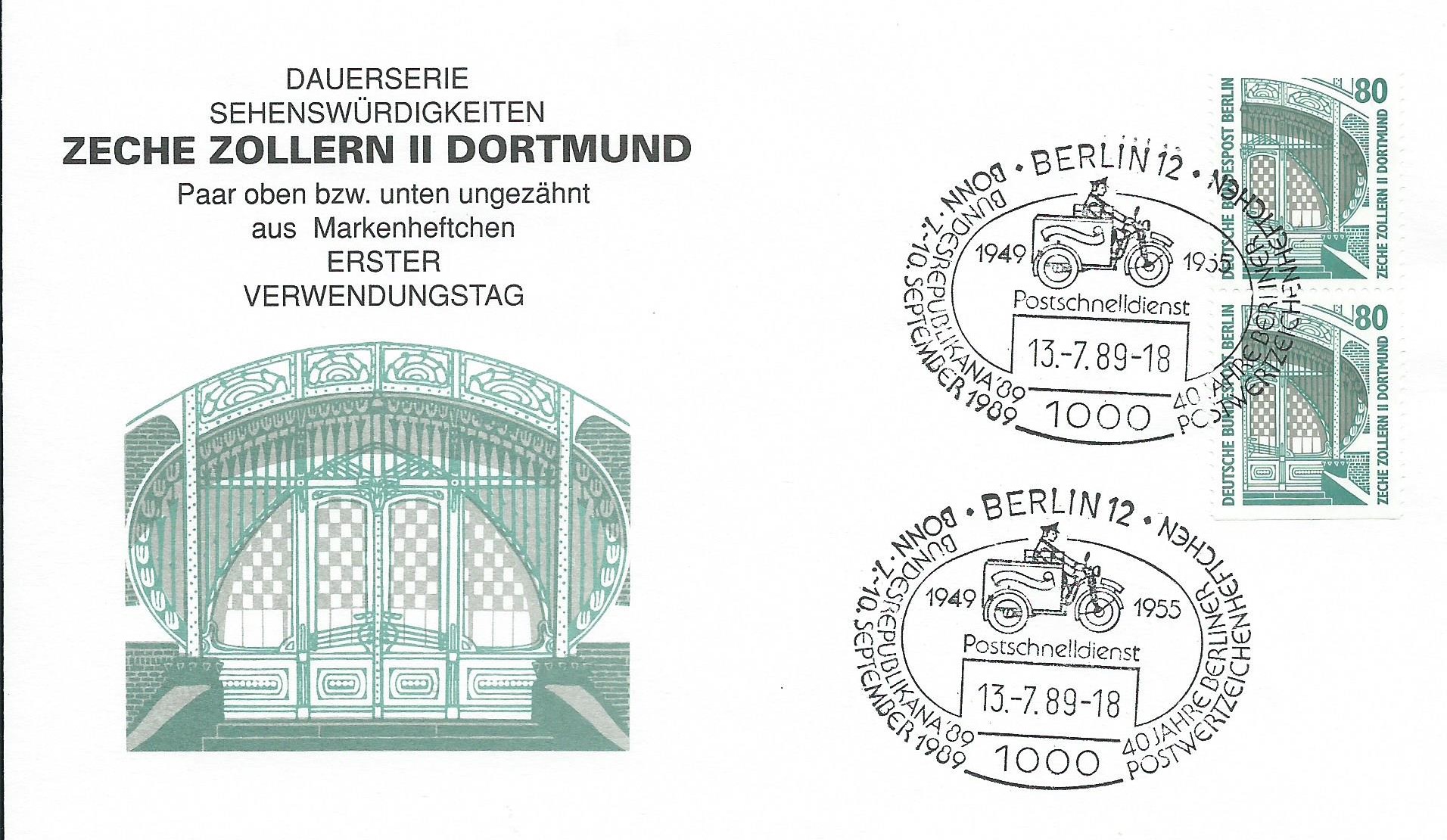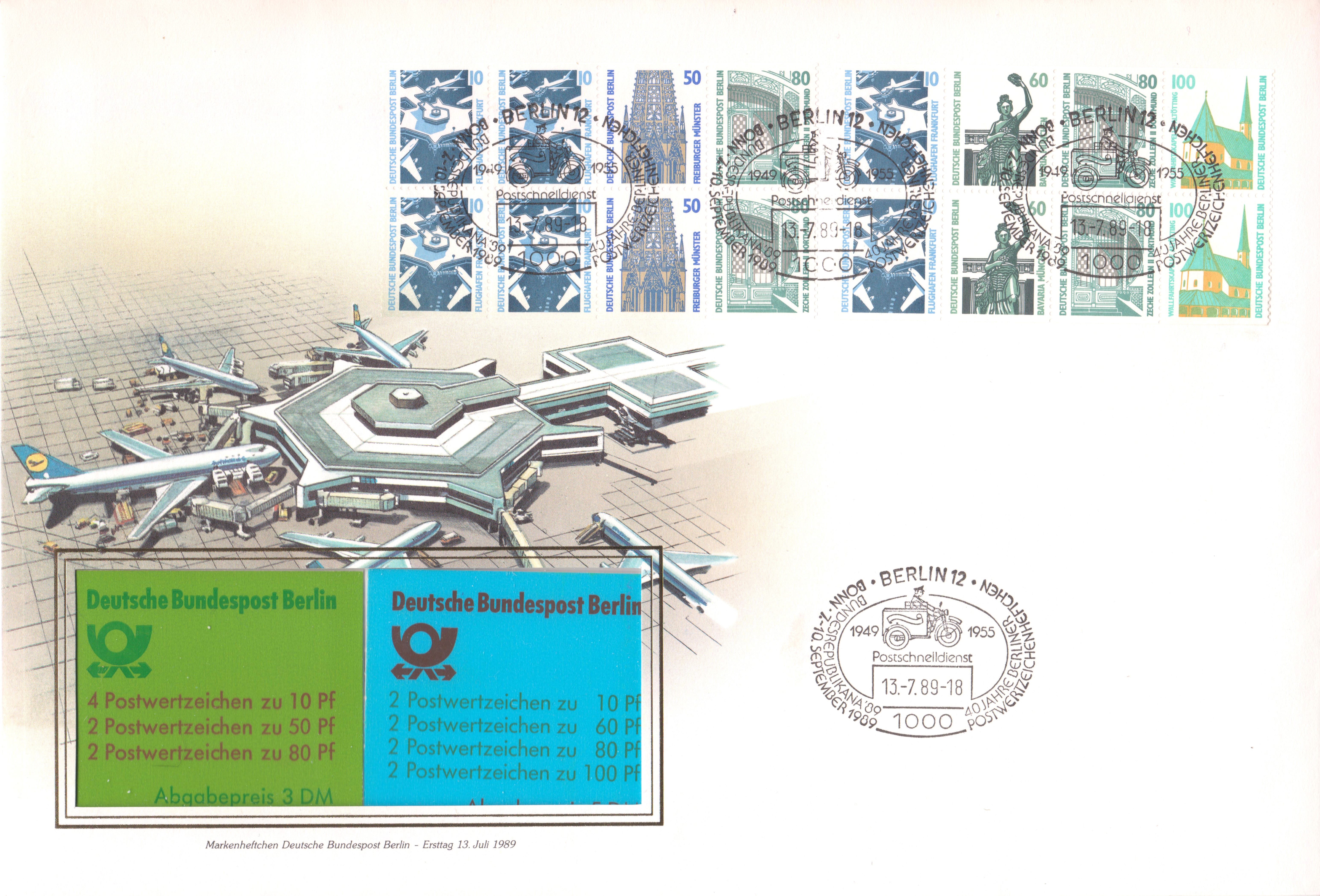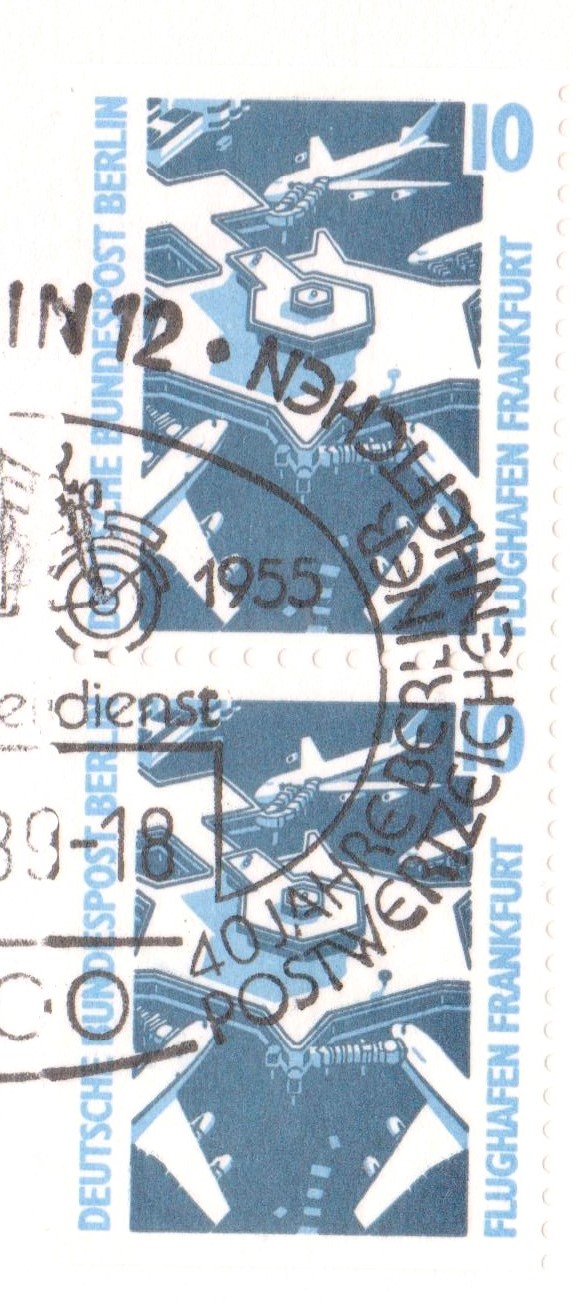 Dieses Beispiel "Kartonphilatelie" zeigt den Plattenfehler Berlin MiNr. 798 I auf Feld 1, also der ersten Marke links oben. Hier ist die Laterne auf dem Terminaldach nur in der Farbe Hellblau gedruckt worden statt normal in Dunkelblau: