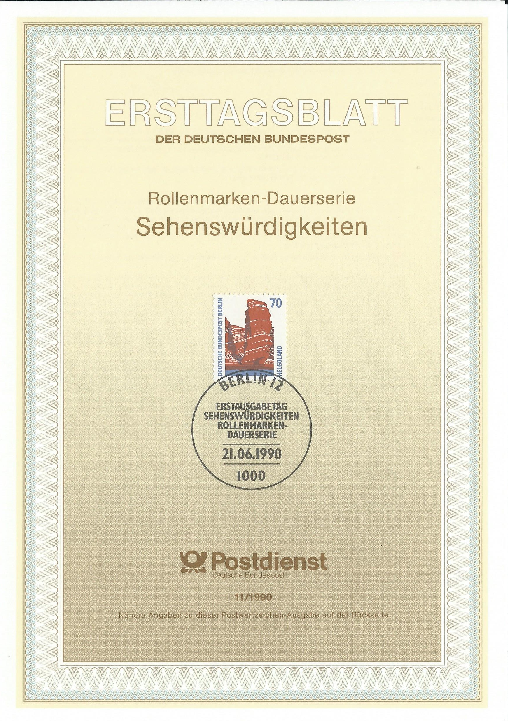 Dazu noch das Ersttagsblatt zu 70 Pf Helgoland, die Marke wurde am 21.6.90 verausgabt. Gestempelt wurde mit dem Ersttagsonderstempel von Berlin.
