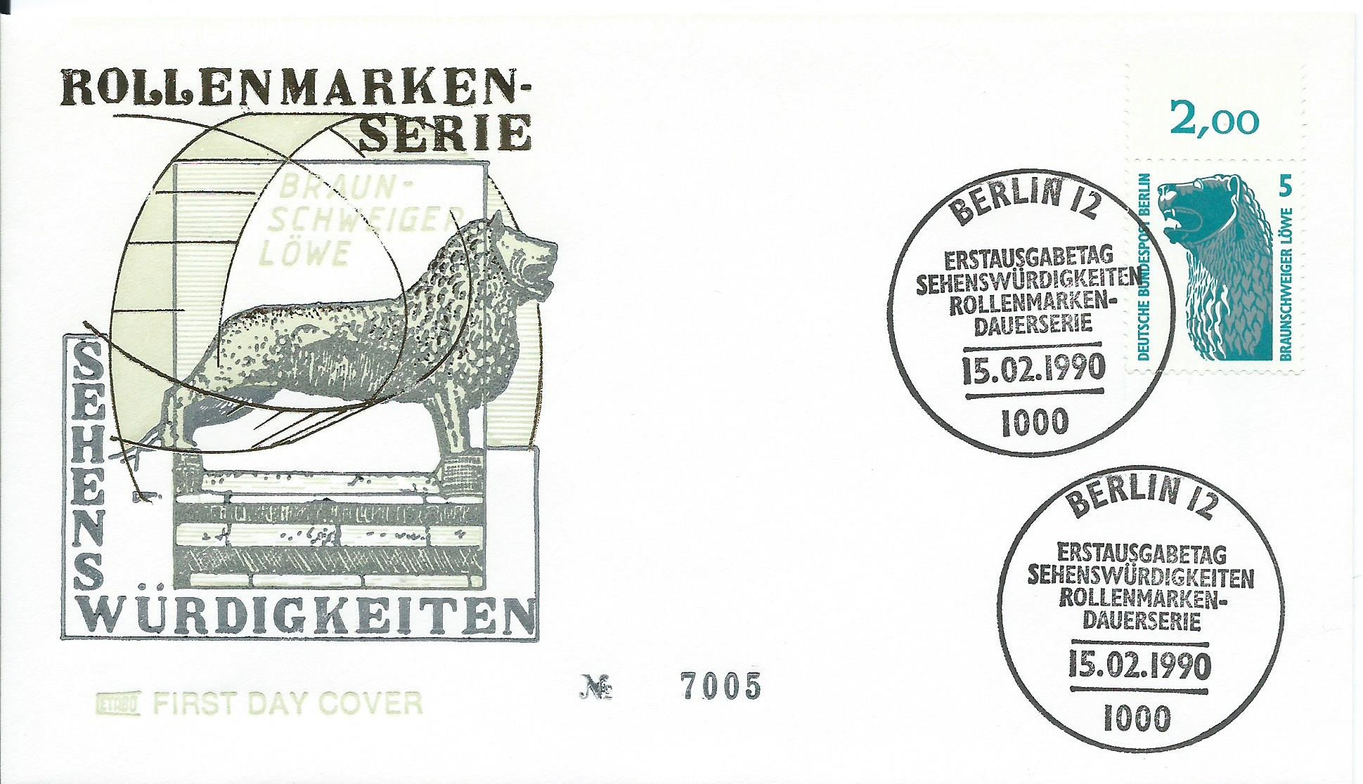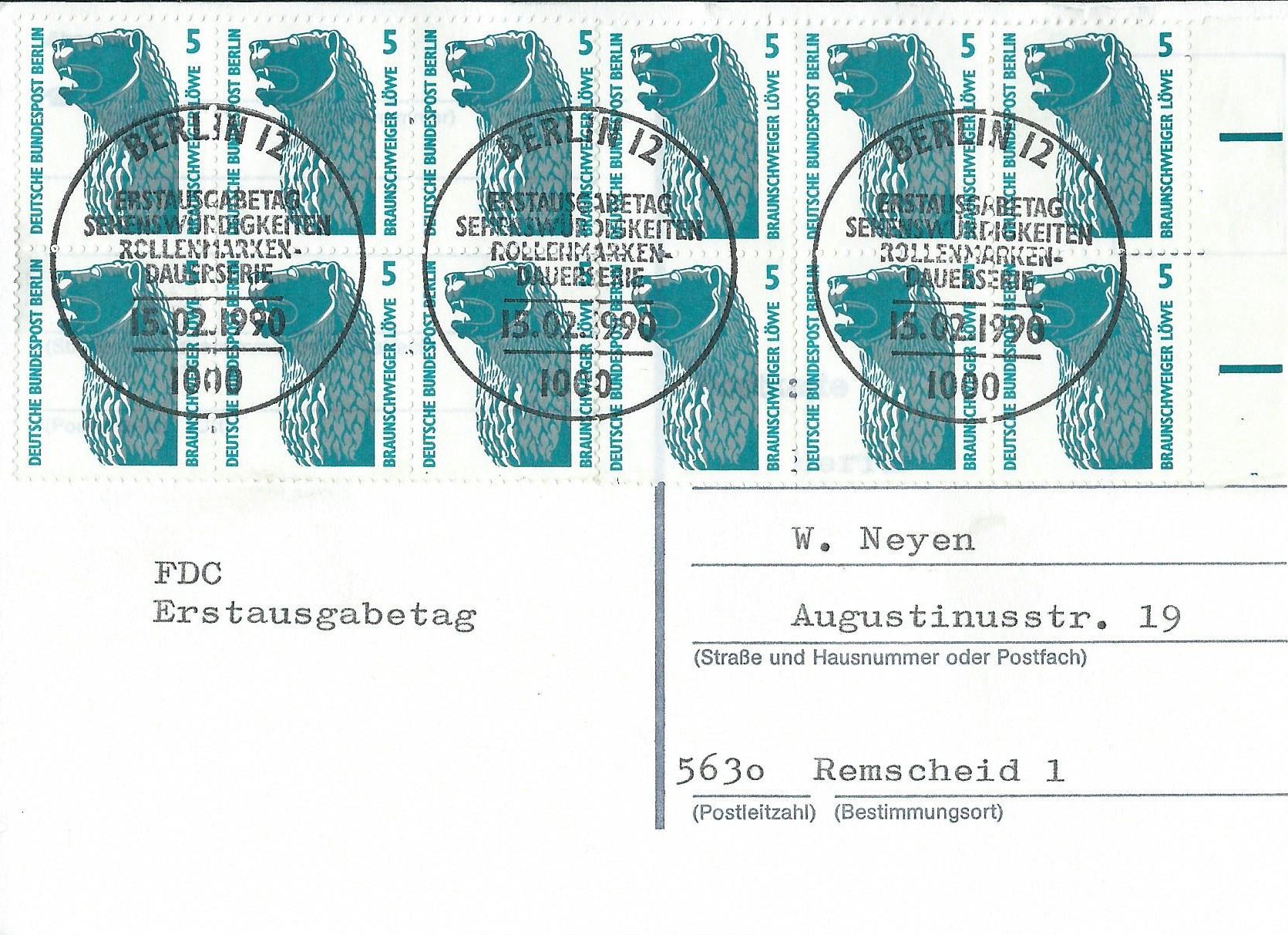 Und der 5 Pf-Wert vom Bogenoberrand mit Reihenwertzähler 2,50 auf Ersttagsbrief mit dem Ersttagstempel Berlin vom 15.2.90: