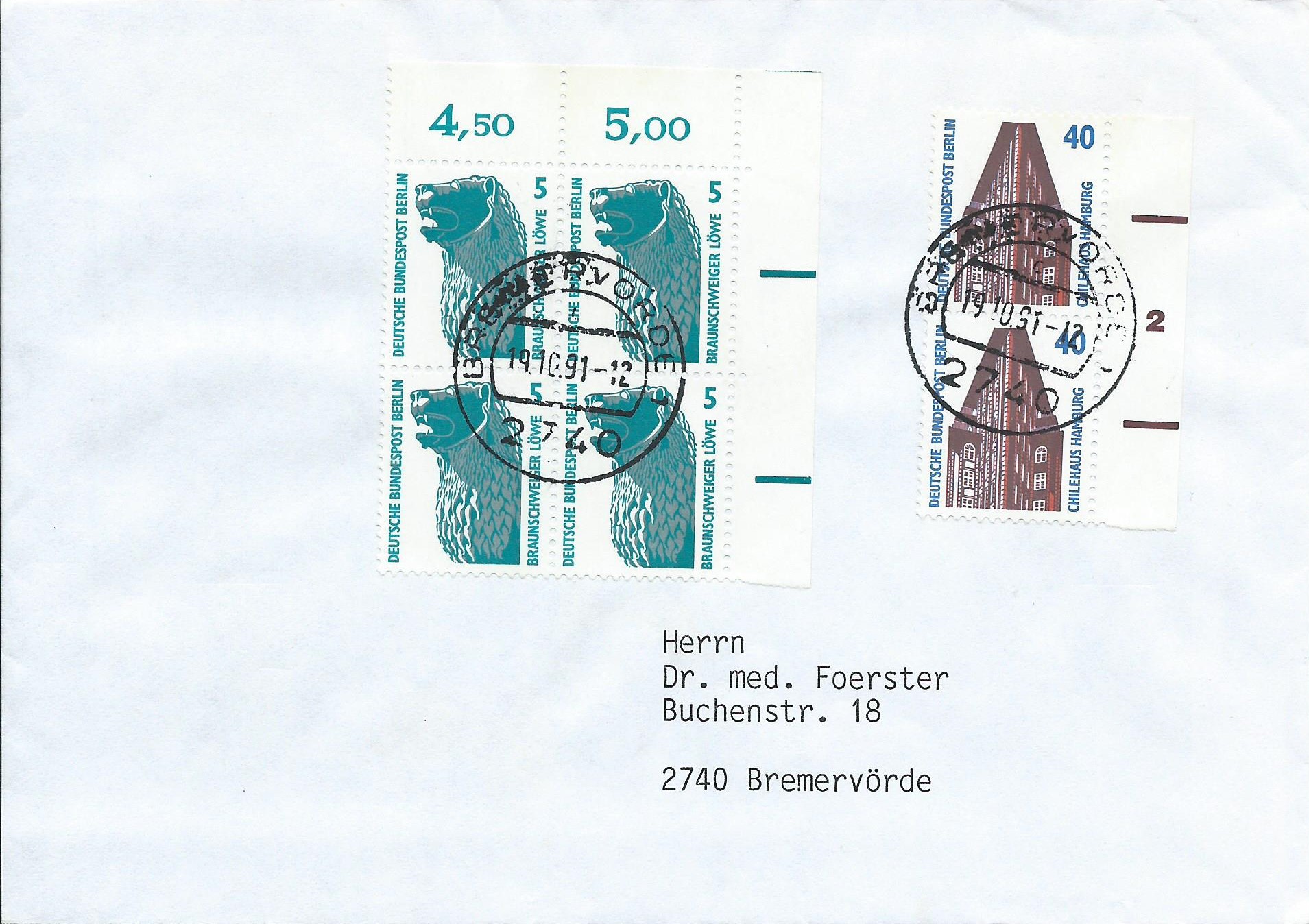 hier kommt ein Beleg, der gleich in 2 Wertstufen passt: Einmal zur 5 Pf und einmal zur 40 Pf-Marke. Von der 5 Pf-Marke wurde ein 4-er-Block aus der rechten oberen Bogenecke veklebt, von der 40 Pf-Marke ein senkrechtes Paar vom rechten Bogenrand mit der Formnummer 2. Gestempelt wurde der Beleg am 19.10.91 in Bremervörde.