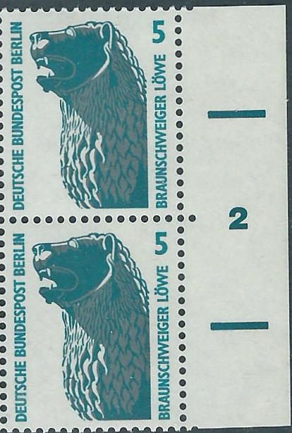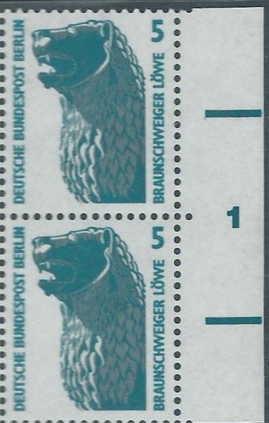 ein postfrisches waagerechtes Paar aus der rechten oberen Bogenecke zu 5 Pf mit entsprechenden Reihenwertzählern und den charakteristischen waagerechten Standstrichen im rechten Seitenrand: