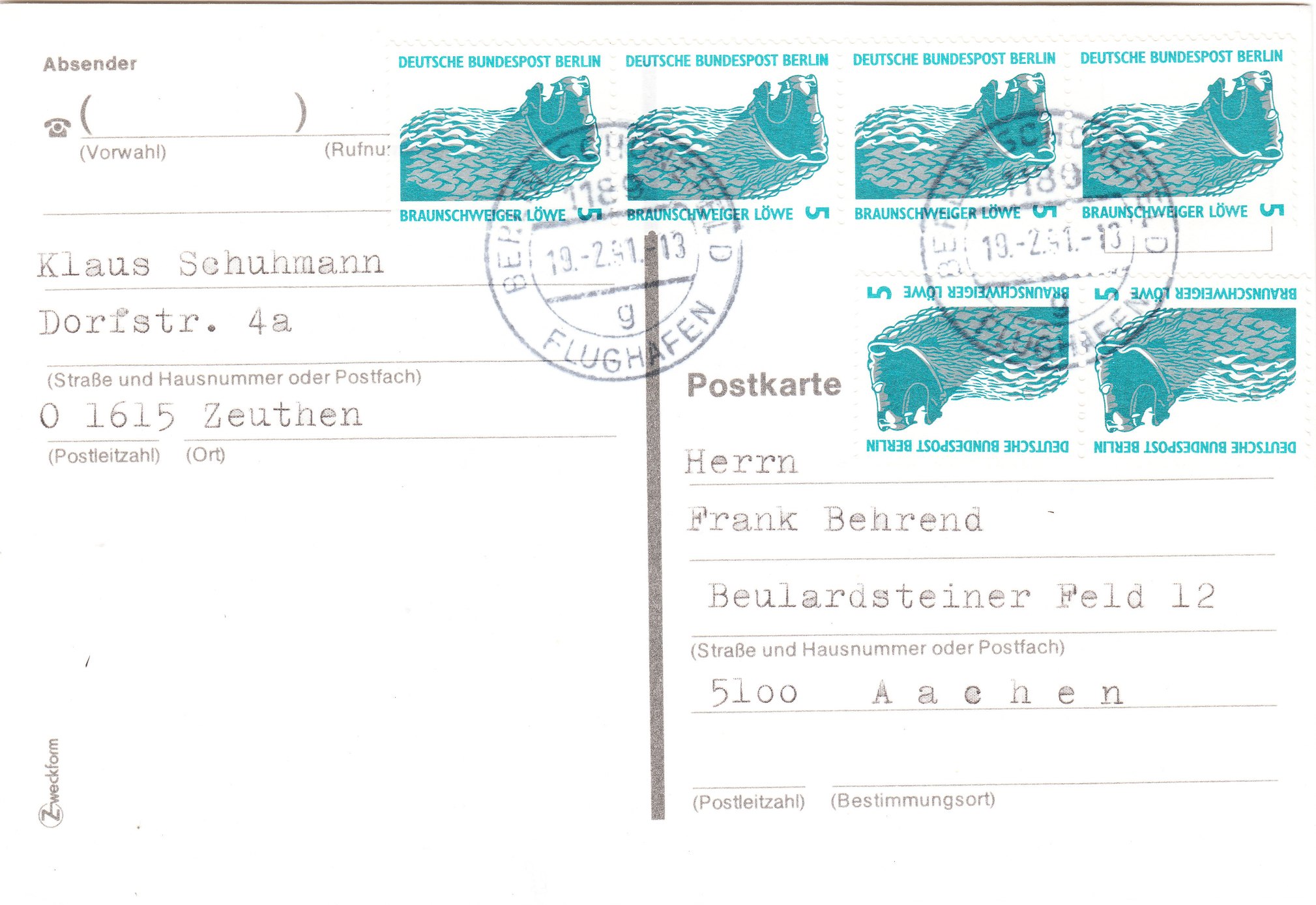 MeF von 6 Stück der MiNr. 863 am 19.02.1991 portogerecht zum vom 01.07.1990 bis zum 31.03.1991 für Postkarten geltenden Sondertarif ab VGO von 30 Pfennig:
