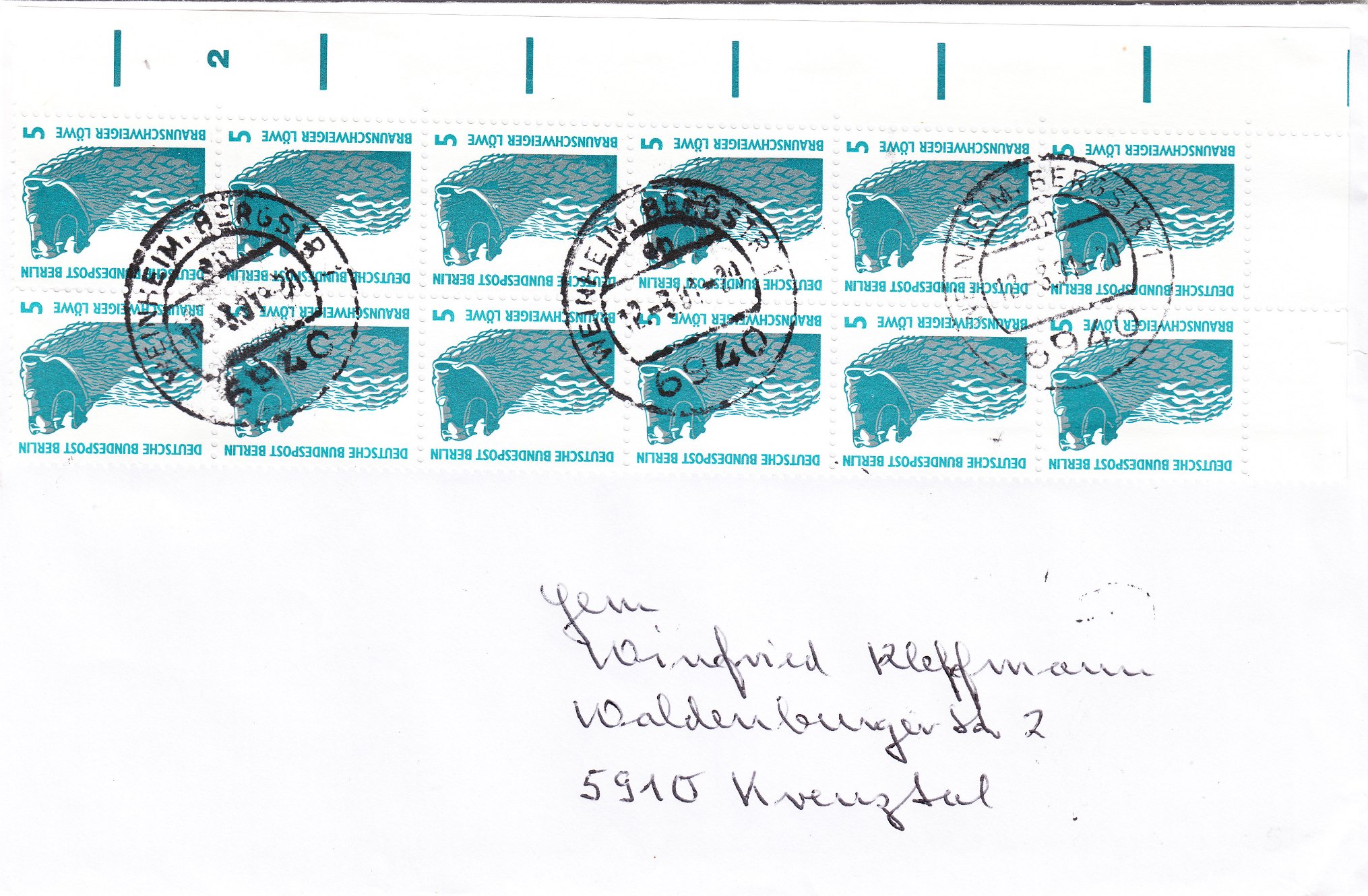 Der erste hat als Frankatur einen waagerechten 8-er-Block ohne Rand und einen senkrechten 4-er-Streifen vom linken Rand. Auffällig sind hier die beiden Bogenzählnummern, eine unten im senkrechten blauen Farbrand und eine oben im weissen Untergrund. Gestempelt wurde er in Berlin 10 am 9.4.90.