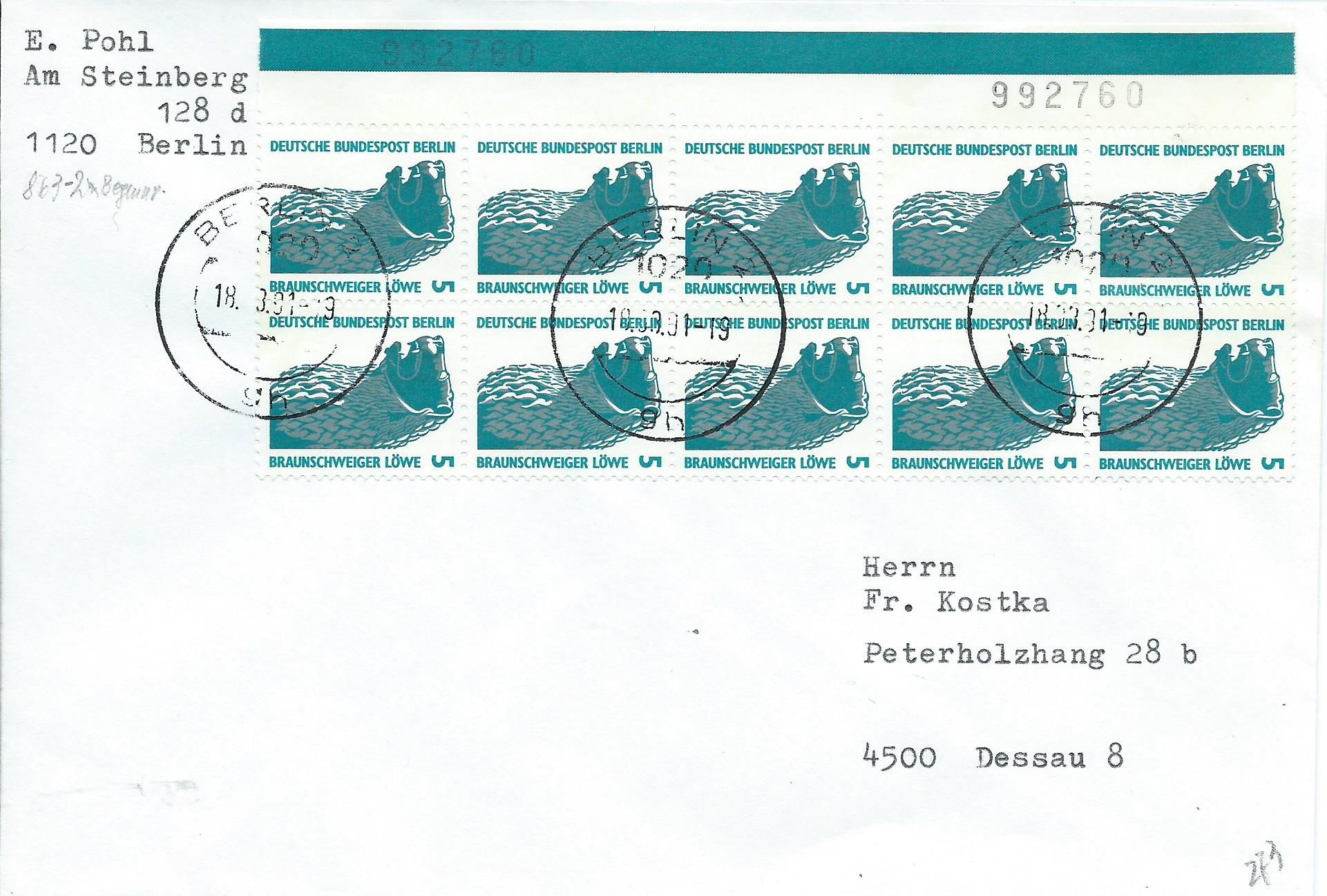 Beim zweiten Beleg wurde ein senkrechter 10-er-Block vom linken Rand verklebt. Auch hier sind wieder 2 Bogenzählnummern erkennbar, allerdings etwas weiter auseinander als auf dem vorherigen Beleg. Und weiterhin interessant ist wieder der Ost-Berlin-Stempel vom 18.3.91.