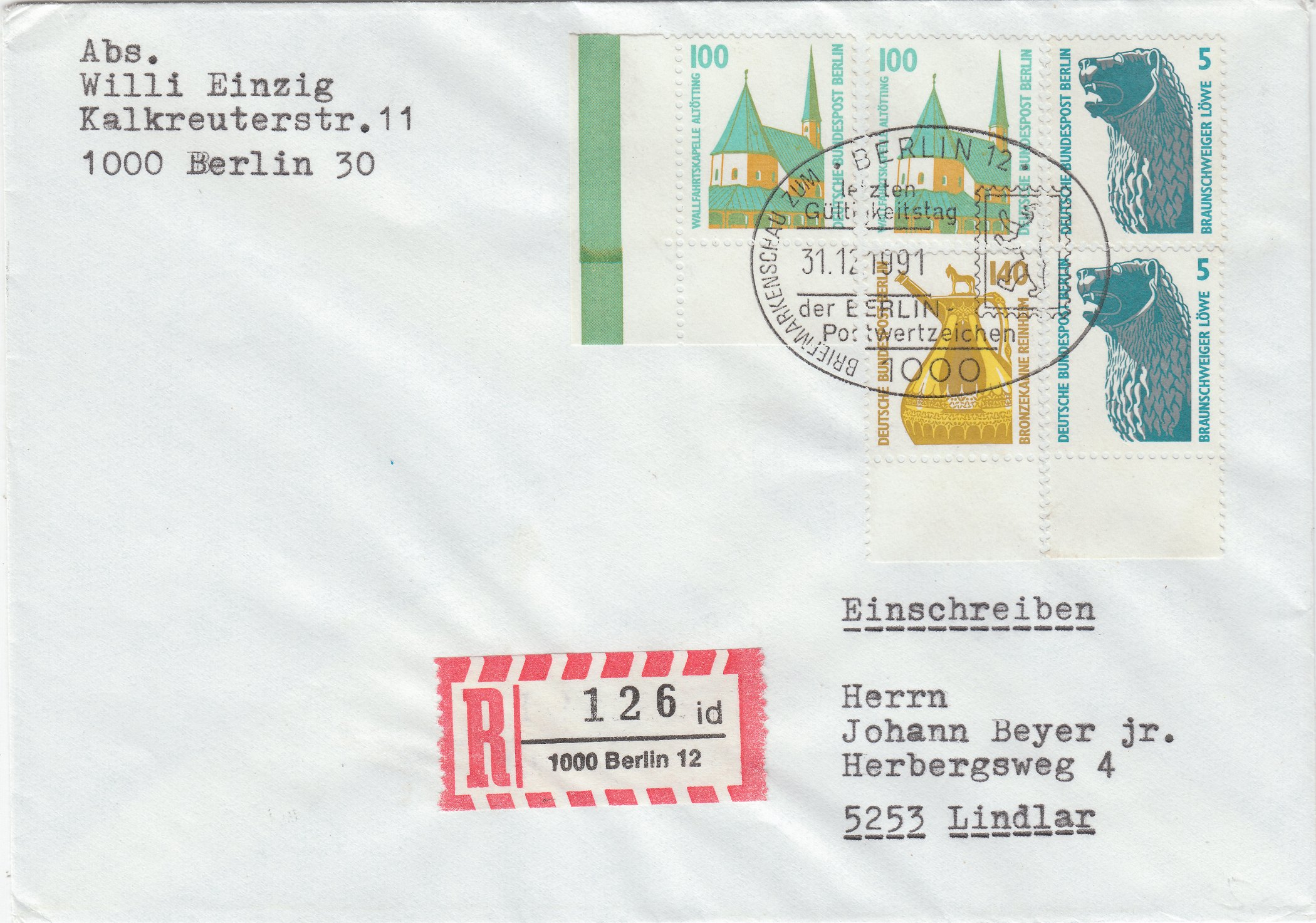 Interessant ist das Datum des Sonderstempels 31.12.1991 als Letzttag der Gültigkeit der BERLIN-Postwertzeichen.