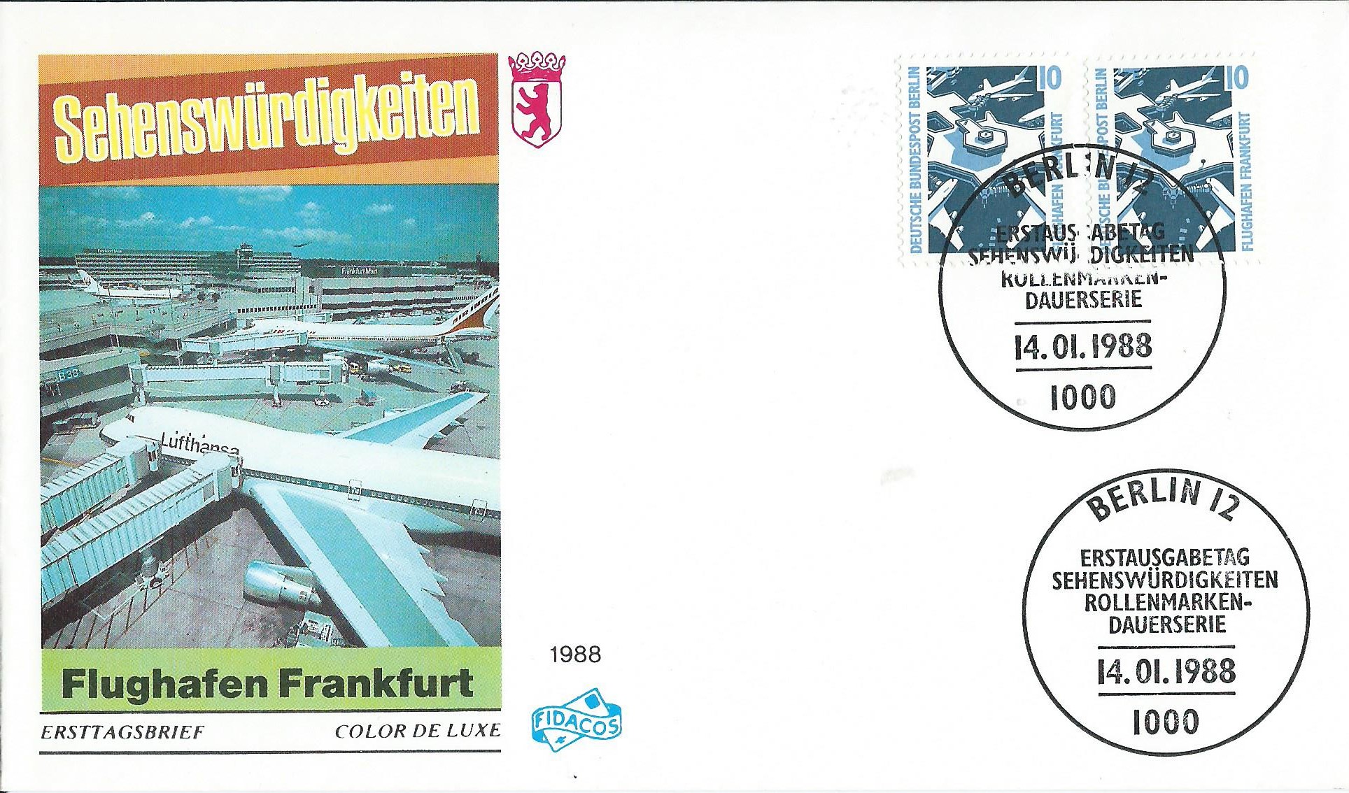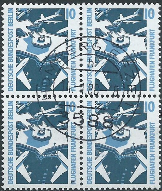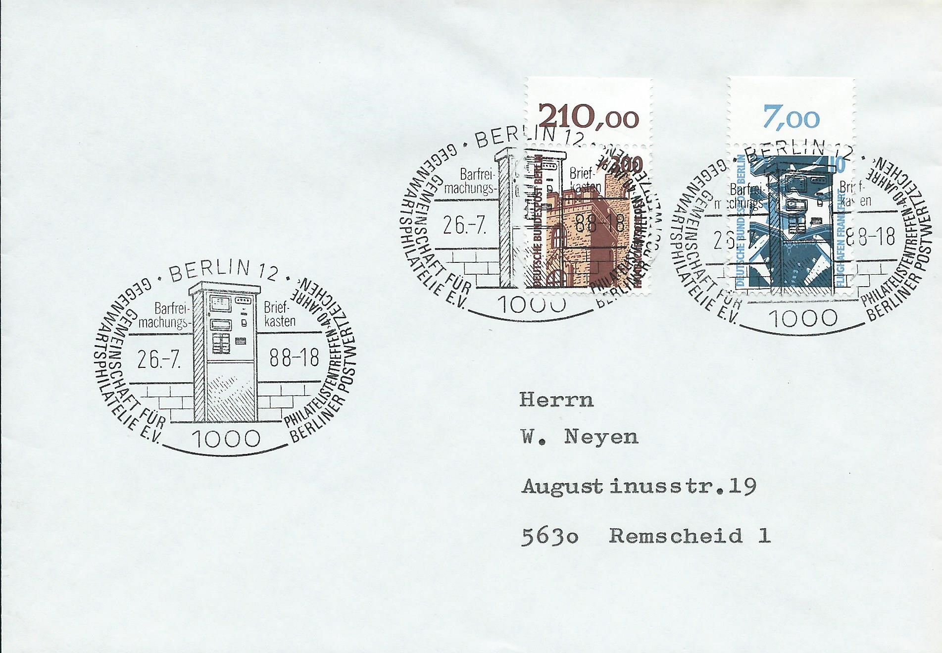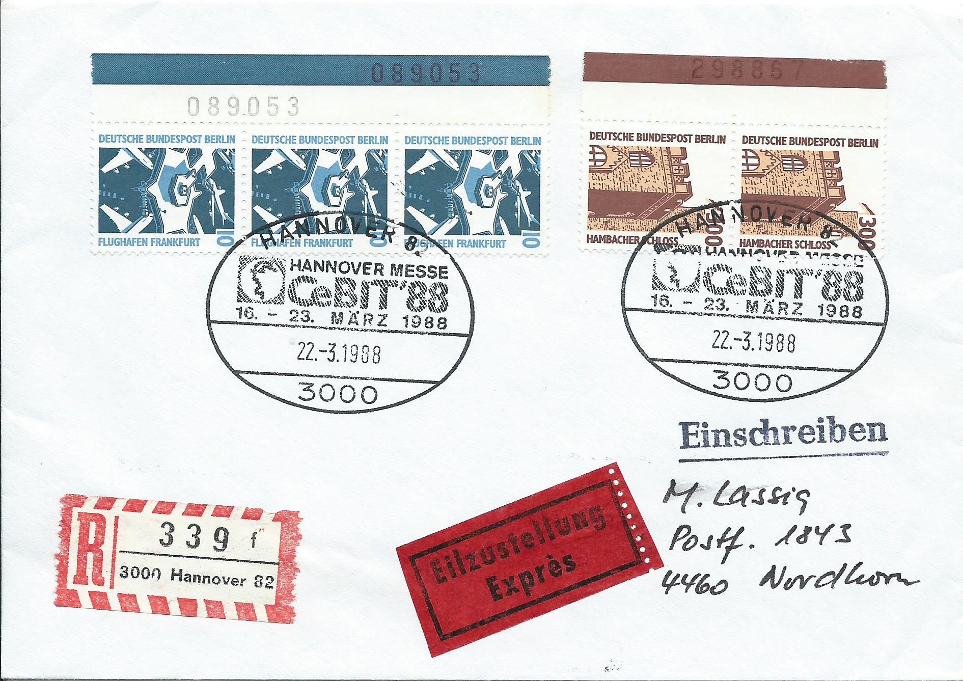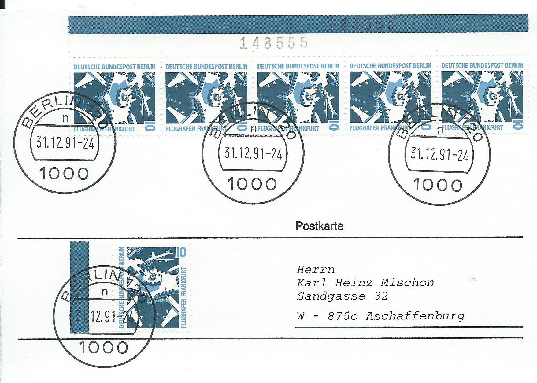 hier kommt ein Beleg, der gleich in 2 Wertstufen passt: Einmal zur 10 Pf und einmal zur 60 Pf-Marke. Von der 10 Pf-Marke sind ein waagrechtes und ein senkrechtes Paar verklebt worden, letzteres vom Bogenoberrand mit Reihenwertzähler 8,00 sowie ein Oberrandstück 60 Pf mit Reihenwertzähler 36,00. Gestempelt wurde der Beleg mit einem Sonderstempel von Frankfurt am Main am 27.9.90.