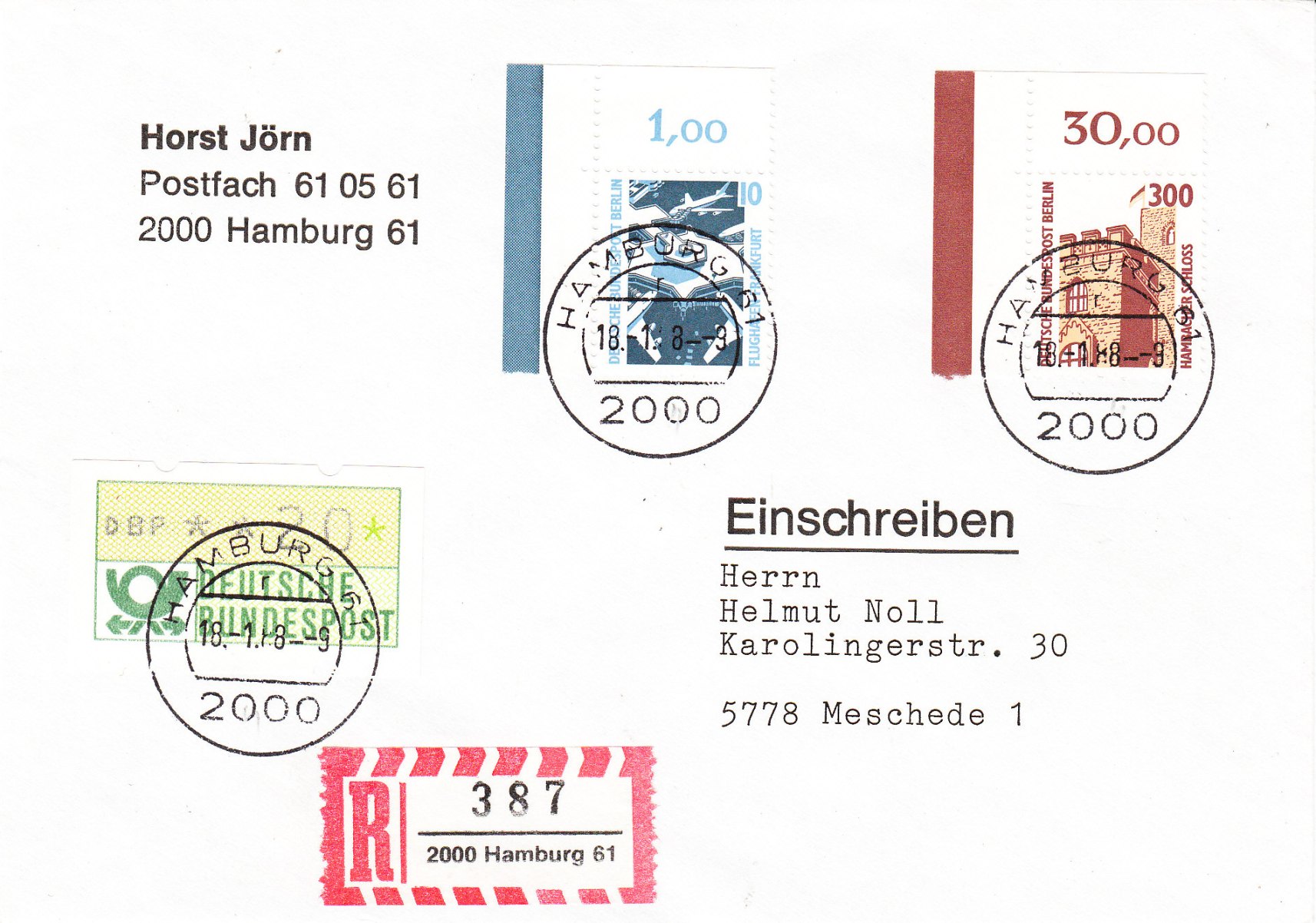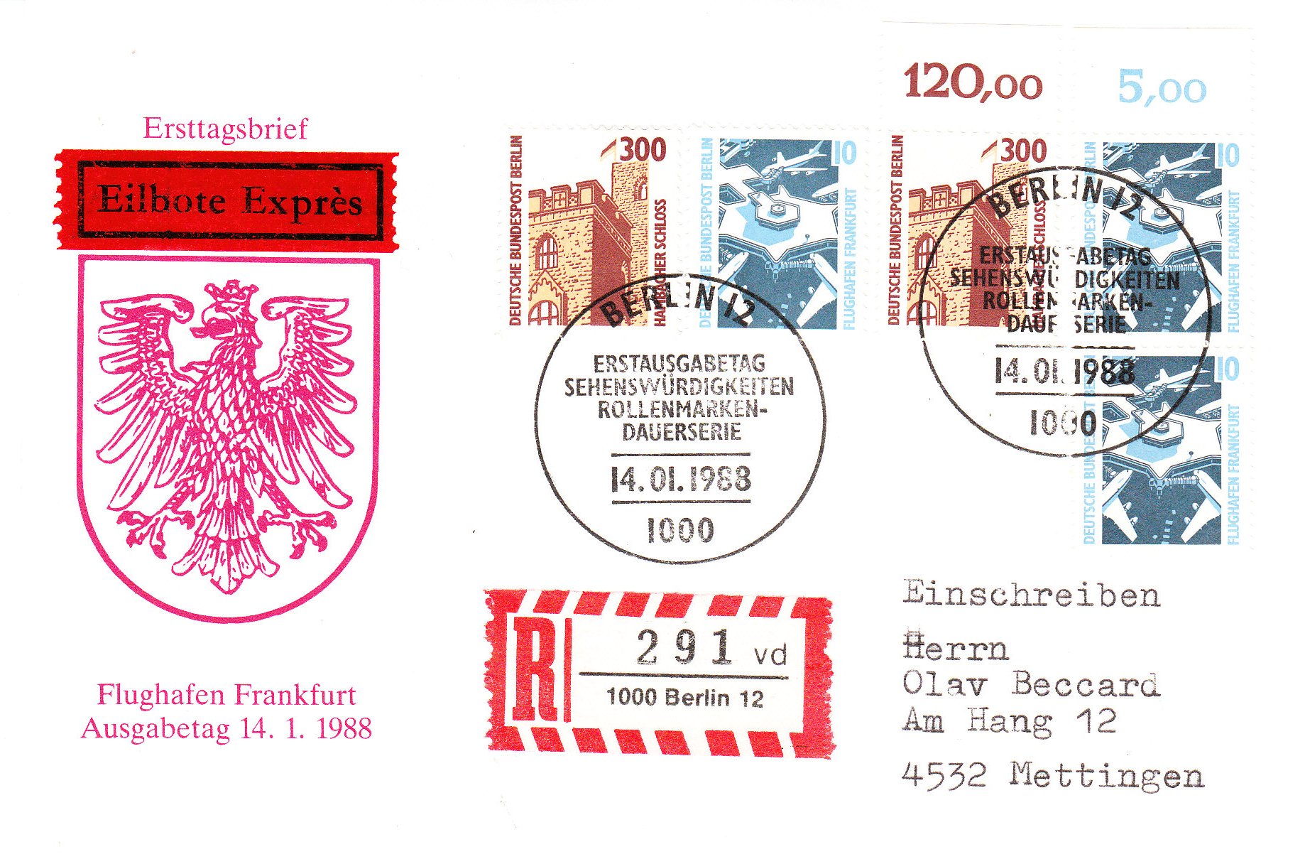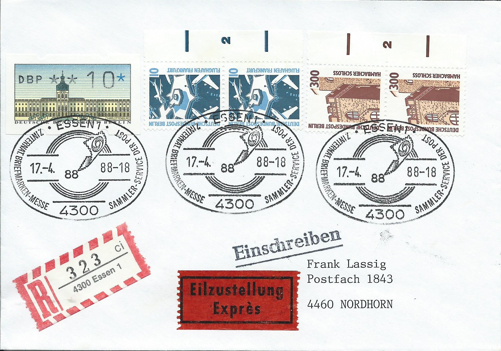hier kommt ein Beleg, der gleich in 2 Wertstufen passt: Einmal zur 10 Pf und einmal zur 300 Pf-Marke. Beide Werte sind im senkrechten Paar vorhanden und haben die Formnummer 2 im Bogenrand. Gestempelt wurde der Einschreib-Eil-Brief am 17.4.88 in Essen mit einem Sonderstempel zur dortigen Messe.