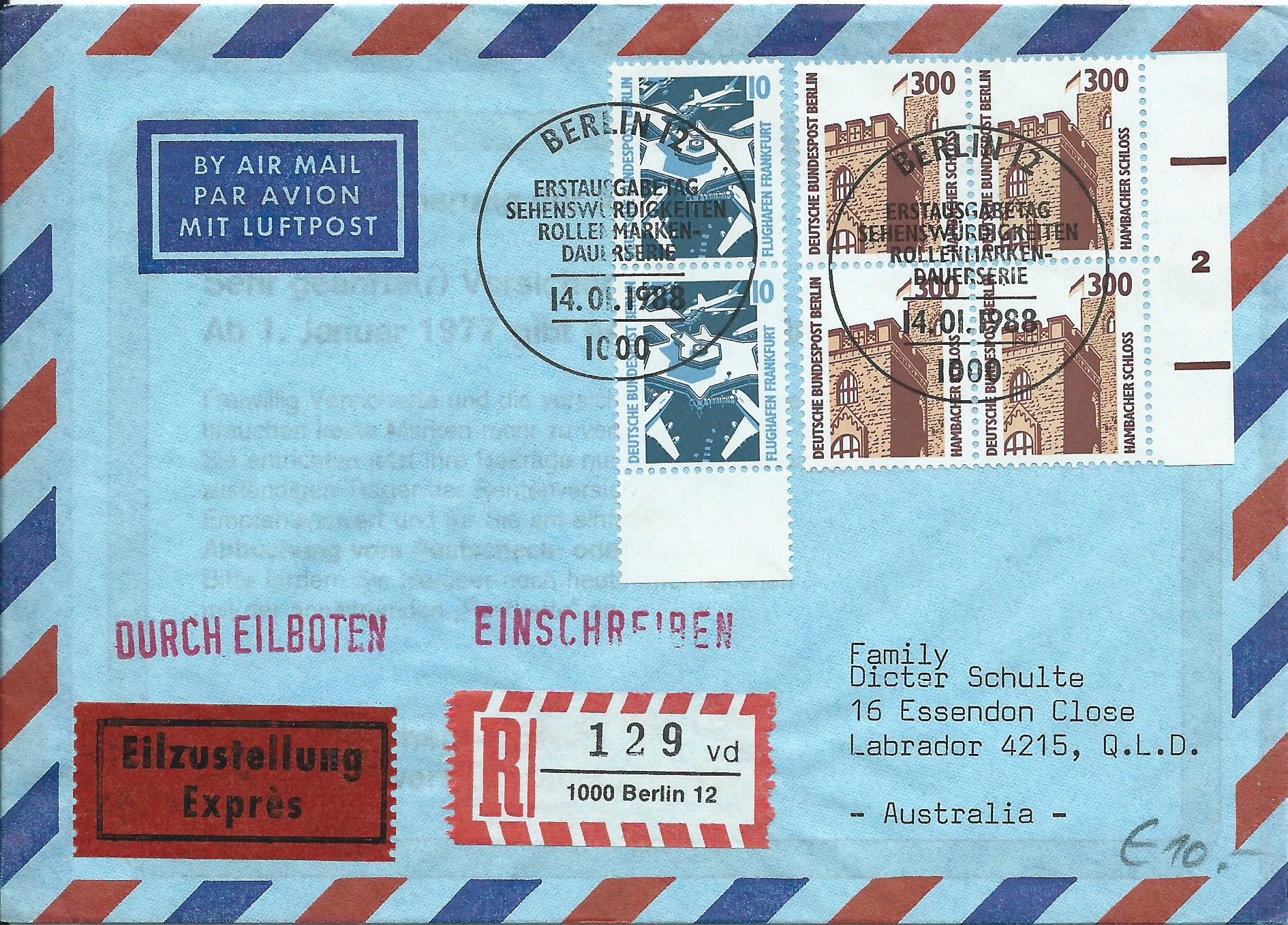 Auch der nächste Beleg passt wieder zu beiden Werten: Ein senkrechtes Paar 10 Pf vom Unterrand und ein 4-er-Block der Marke zu 300 Pf vom rechten Seitenrand, auch hier ist wieder die Formnummer 2 zu sehen. Das ganze klebt auf einem Einschreib-Eil-Brief nach Australien. Gestempelt wurde der Beleg am 14.1.88 in Berlin mit dem passenden Ersttagsonderstempel.