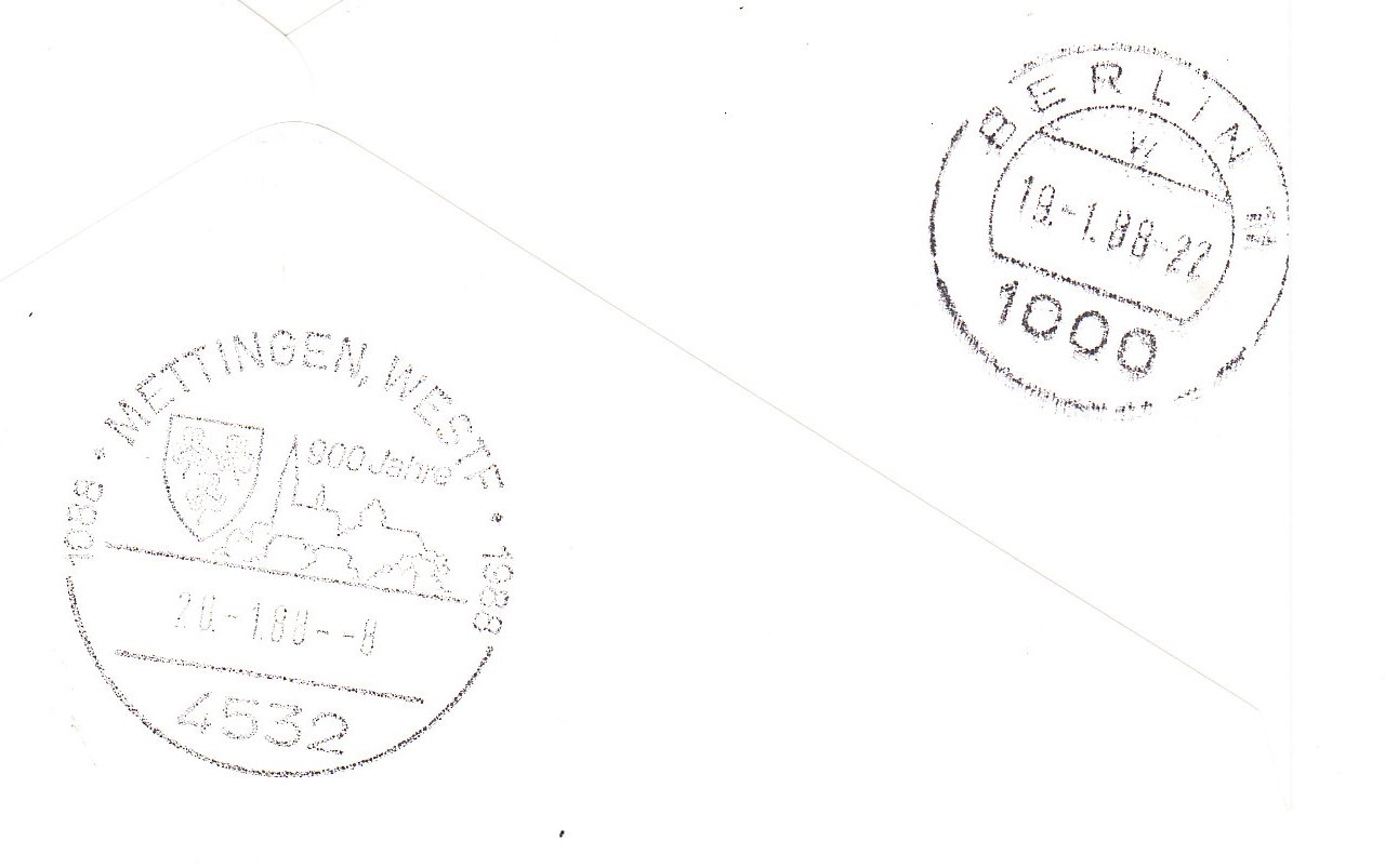 Betrachtet man auch die Stempel auf der Rückseite, dann kann man erkennen, dass dieser Beleg am 19.1.88 um 22 Uhr in Berlin aufgegeben wurde, um am 20.1.88 um 8 Uhr früh in Mettingen anzukommen.