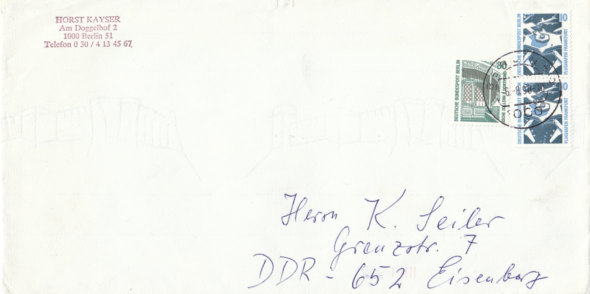 Standardbrief (100 Pf), am 06.08.1990 portogerecht freigemacht mit einem senkrechten Paar des 10 Pf Wertes SWK, Ausgabe Berlin, Michel 798 C/D, sowie einer oben ungezähnten 80er, Ausgabe Berlin, Michel 796 C.