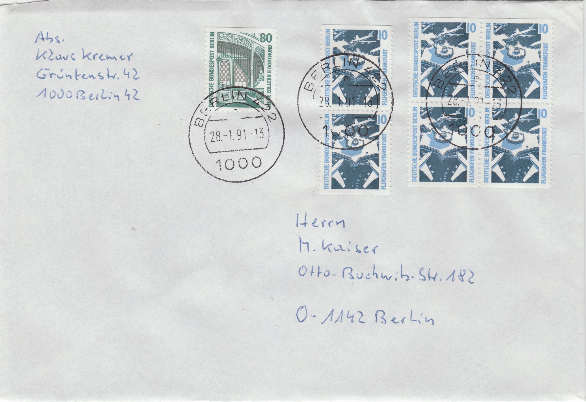 Dieser am 28.01.1991 in "Berlin 422" aufgegebene Brief von 51 bis 100 g im Ortsverkehr wurde portogerecht frankiert mit lauter teilgeschnittenen Postwertzeichen aus Markenheftchen: