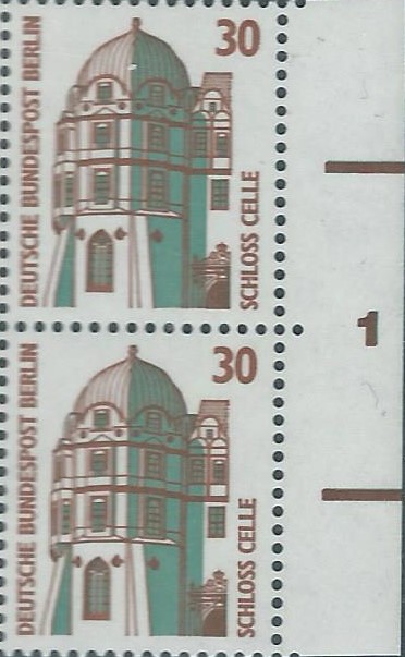 ein postfrisches waagerechtes Paar aus der rechten oberen Bogenecke zu 30 Pf mit entsprechenden Reihenwertzählern und den charakteristischen waagerechten Standstrichen im rechten Seitenrand: