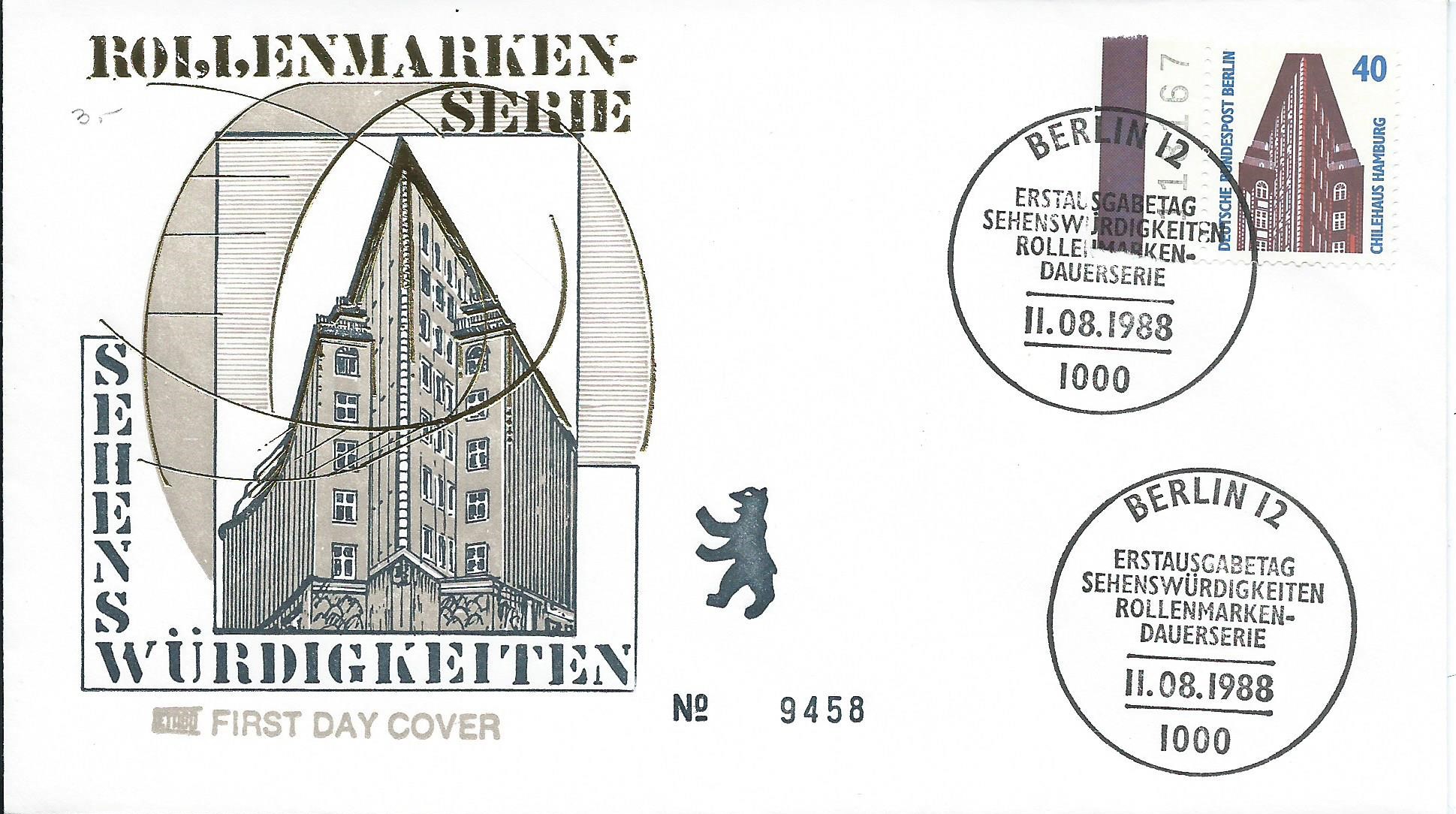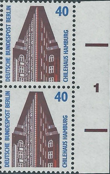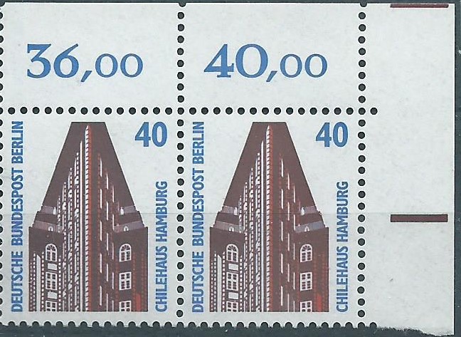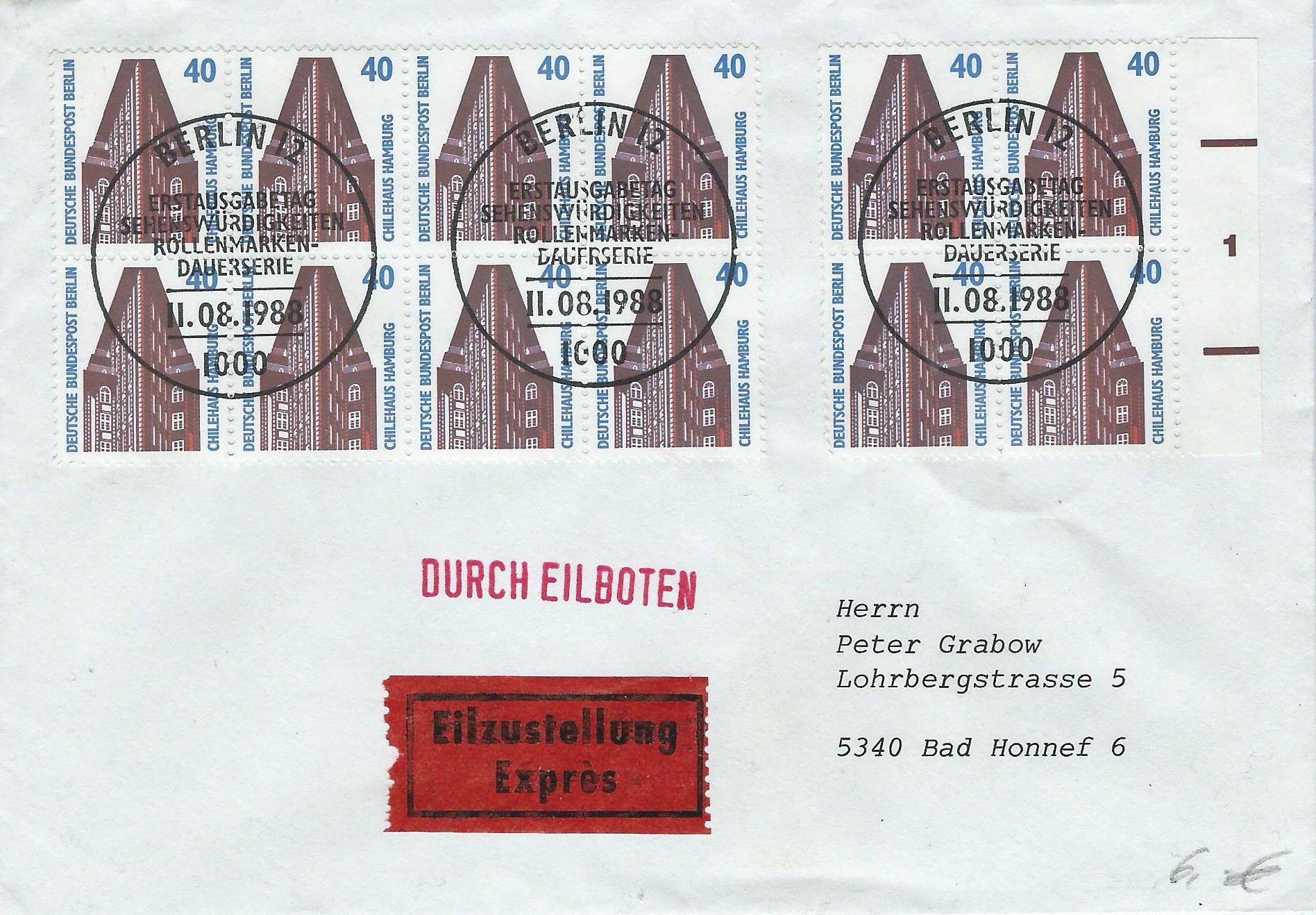 hier kommt ein Beleg, der gleich in 2 Wertstufen passt: Einmal zur 5 Pf und einmal zur 40 Pf-Marke. Von der 5 Pf-Marke wurde ein 4-er-Block aus der rechten oberen Bogenecke veklebt, von der 40 Pf-Marke ein senkrechtes Paar vom rechten Bogenrand mit der Formnummer 2. Gestempelt wurde der Beleg am 19.10.91 in Bremervörde.