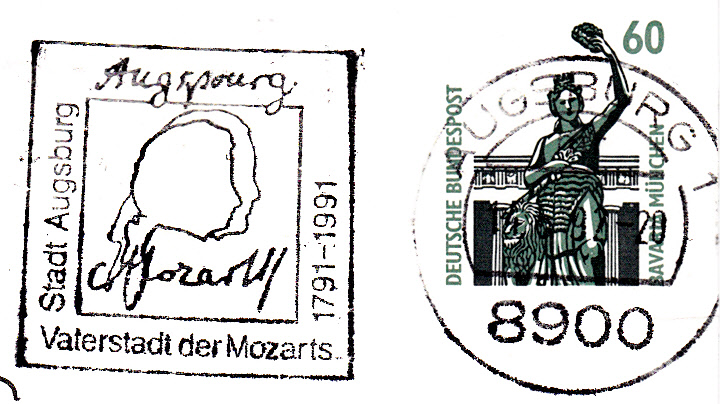 Mozarts Vater war der aus Augsburg zum Studium an der Benediktineruniversität nach Salzburg gezogene, fürstbischöfliche Kammermusikus (ab 1757 Hofkomponist und ab 1763 Vizekapellmeister) Leopold Mozart. Der Maschinenwerbestempel aus 8900 Augsburg erinnert an die Herkunft der "Mozarts" und den 200. Todestag von W.A. Mozart.