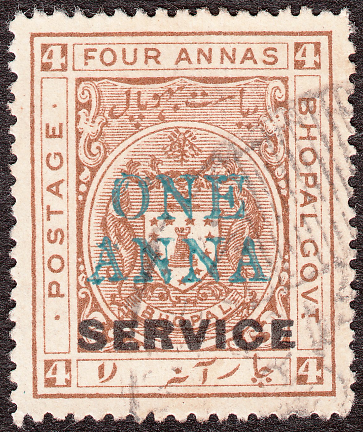 Die Dienstmarke Bhopal MiNr. D 13 zu 4 Annas in braun wurde mit einem Aufdruck "ONE ANNA" versehen und als Dienstmarke Bhopal MiNr. D 22 ausgegeben: