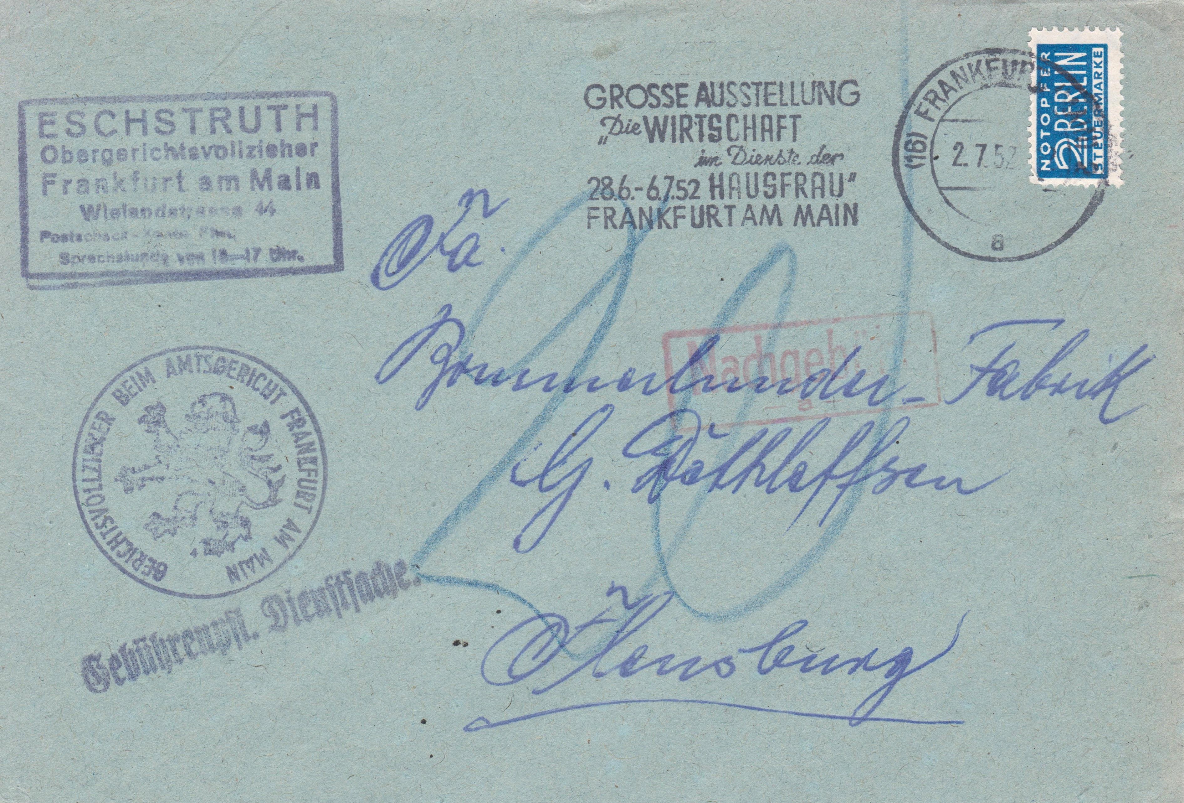 "Gebührenpfl. Dienstsache" am 02.07.1952 als Brief im Fernverkehr von FRANKFURT nach Flensburg: