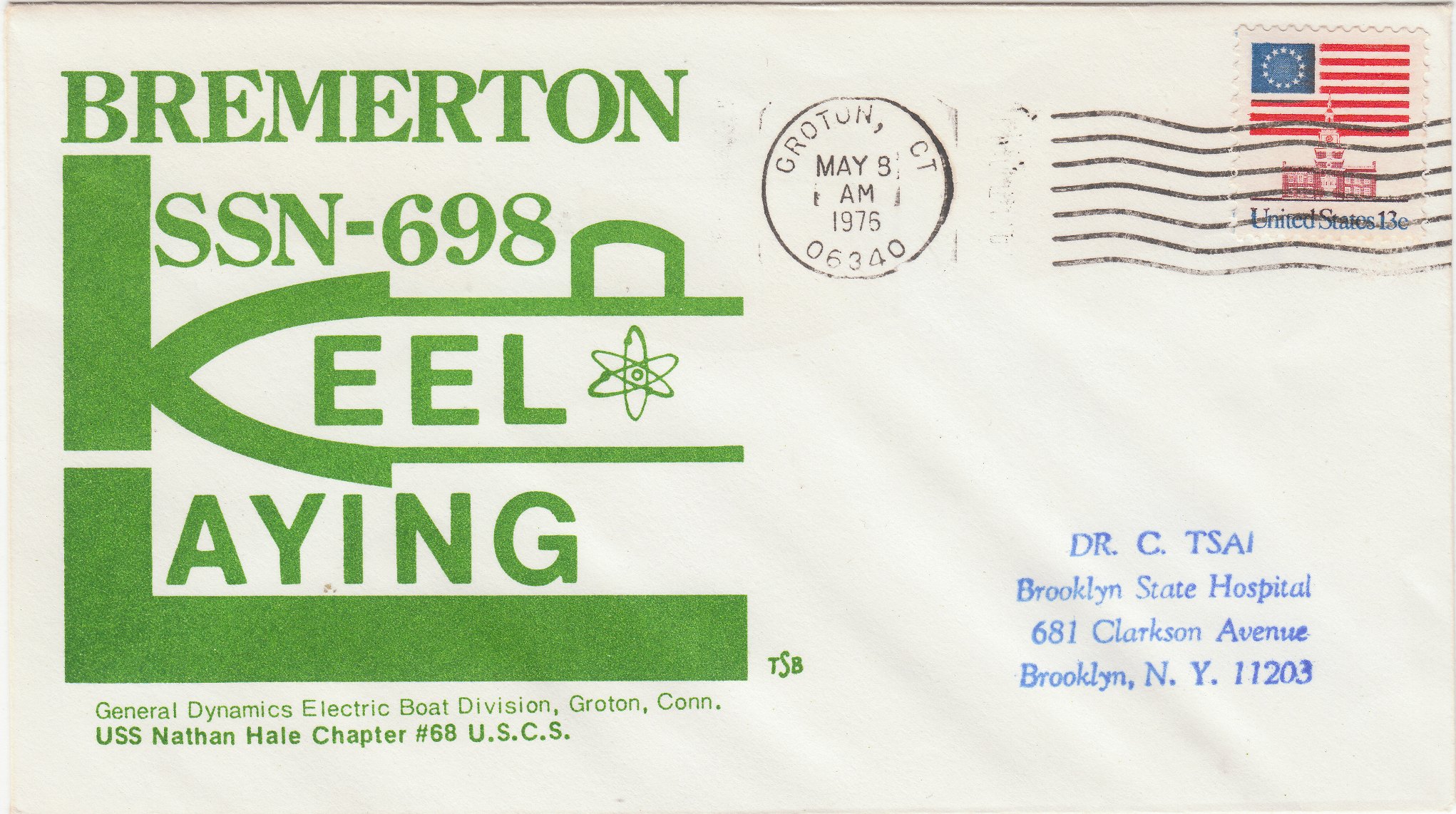 Die Kiellegung der USS BREMERTON (SSN-698) erfolgte am 08.05.1975 bei General Dynamics Electric Boat Division, Groton, Connecticut, was dieser Beleg dokumentiert: