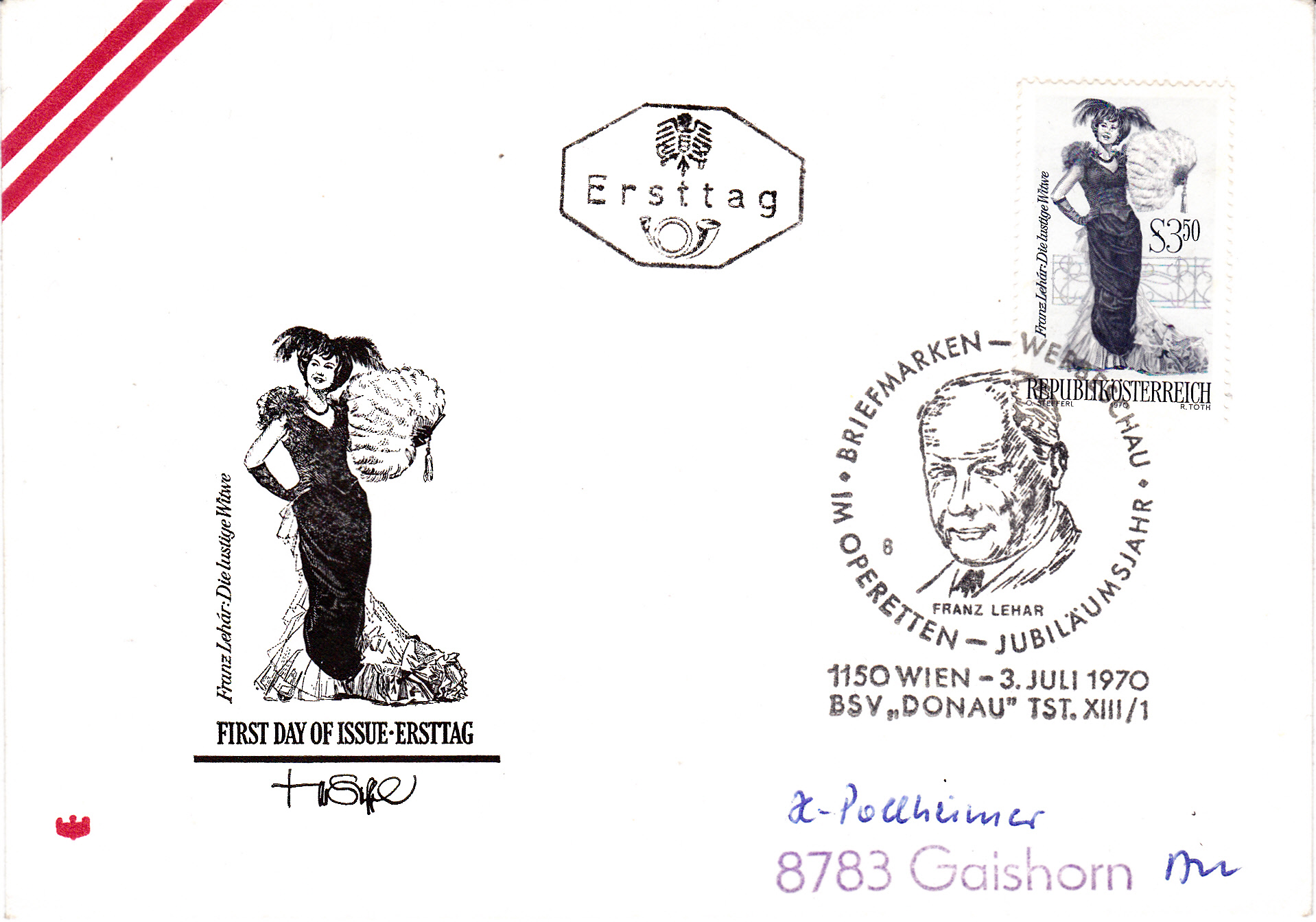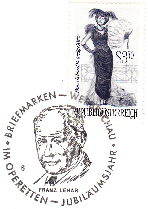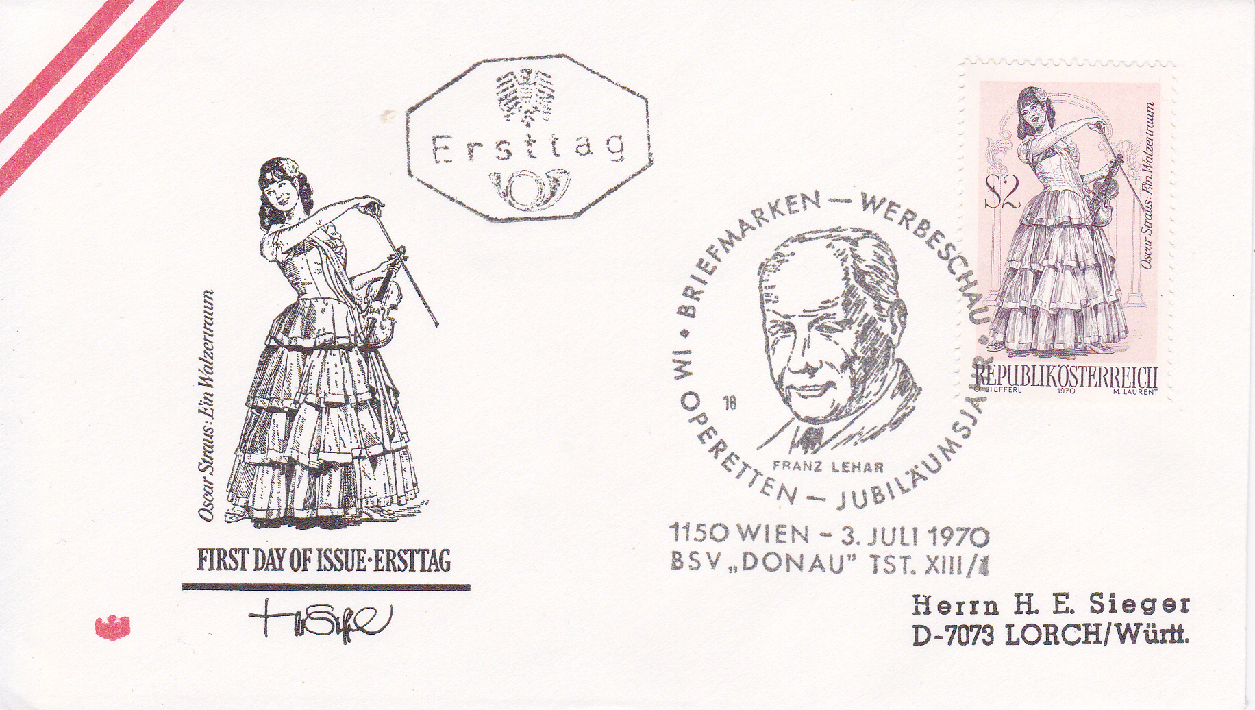 Sonderstempel aus Wien vom Ersttag der Serie "Operetten" vom 3.7.1970 aus Österreich mit einem Porträt von Franz Lehar.