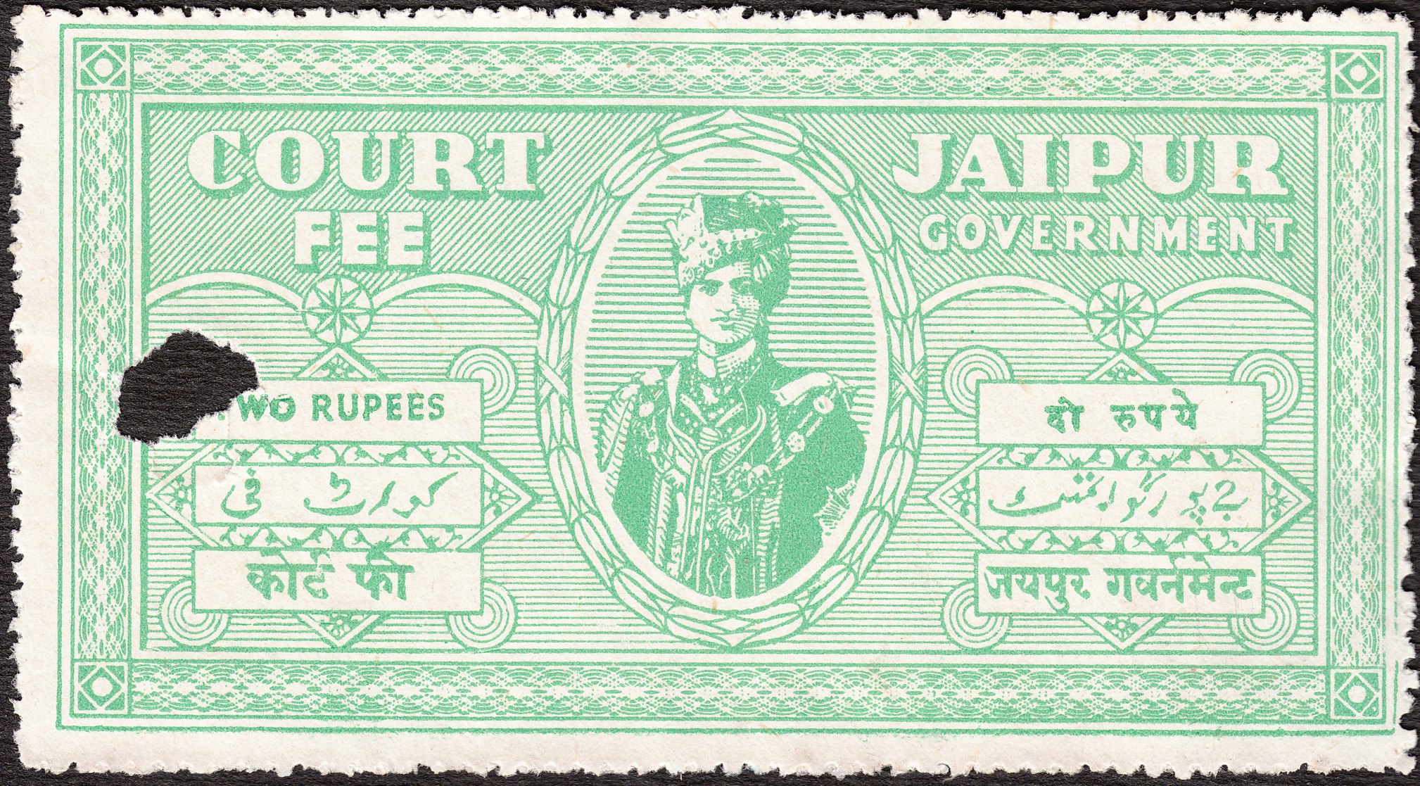 Diese Gebührenmarke "COURT FEE" aus Jaipur in Type 10 zu 2 Rupien zeigt Maharadscha Sir Sawai Man Singhji Bahadur:
