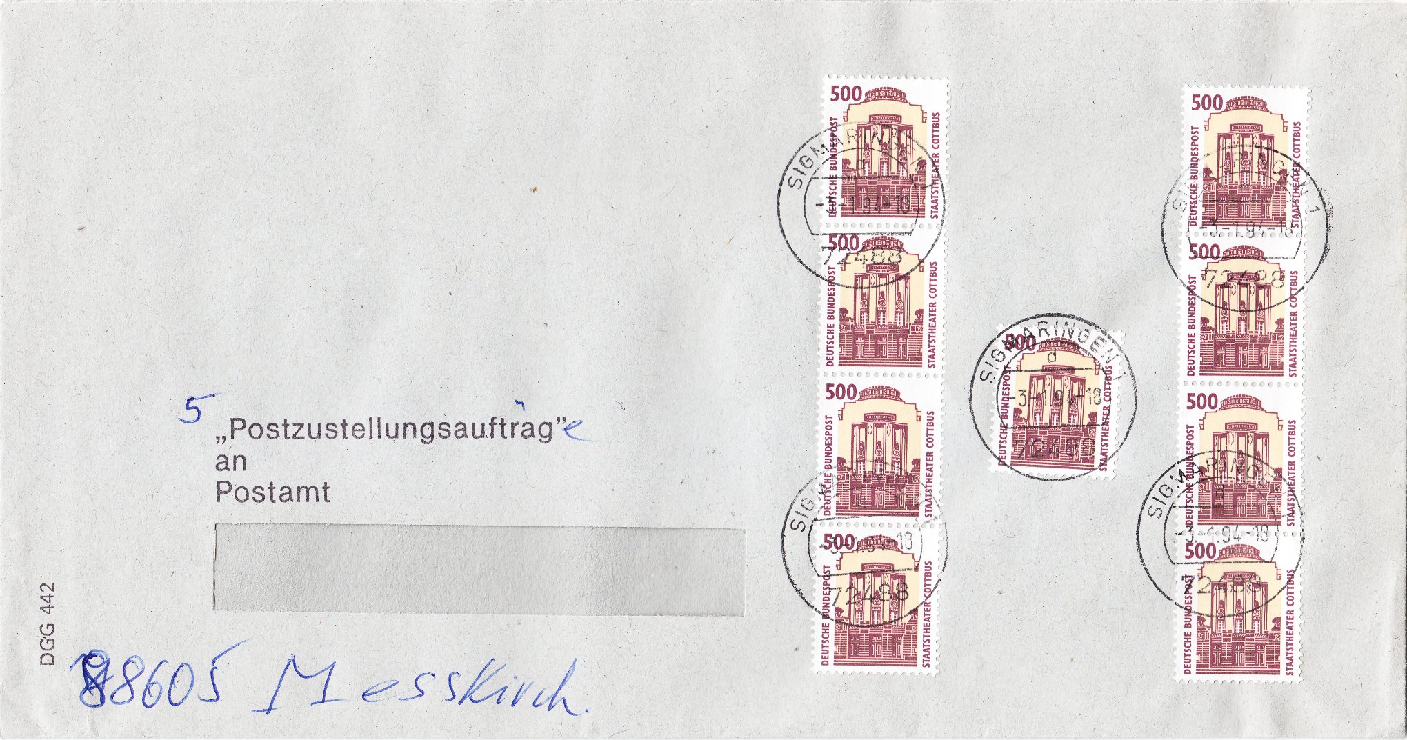 Mehrfachfrankatur von 9 Stück der Wertstufe 500 Pfennig am 03.01.1994 auf einem Beleg, der "5 Postzustellungsaufträge" enthielt: