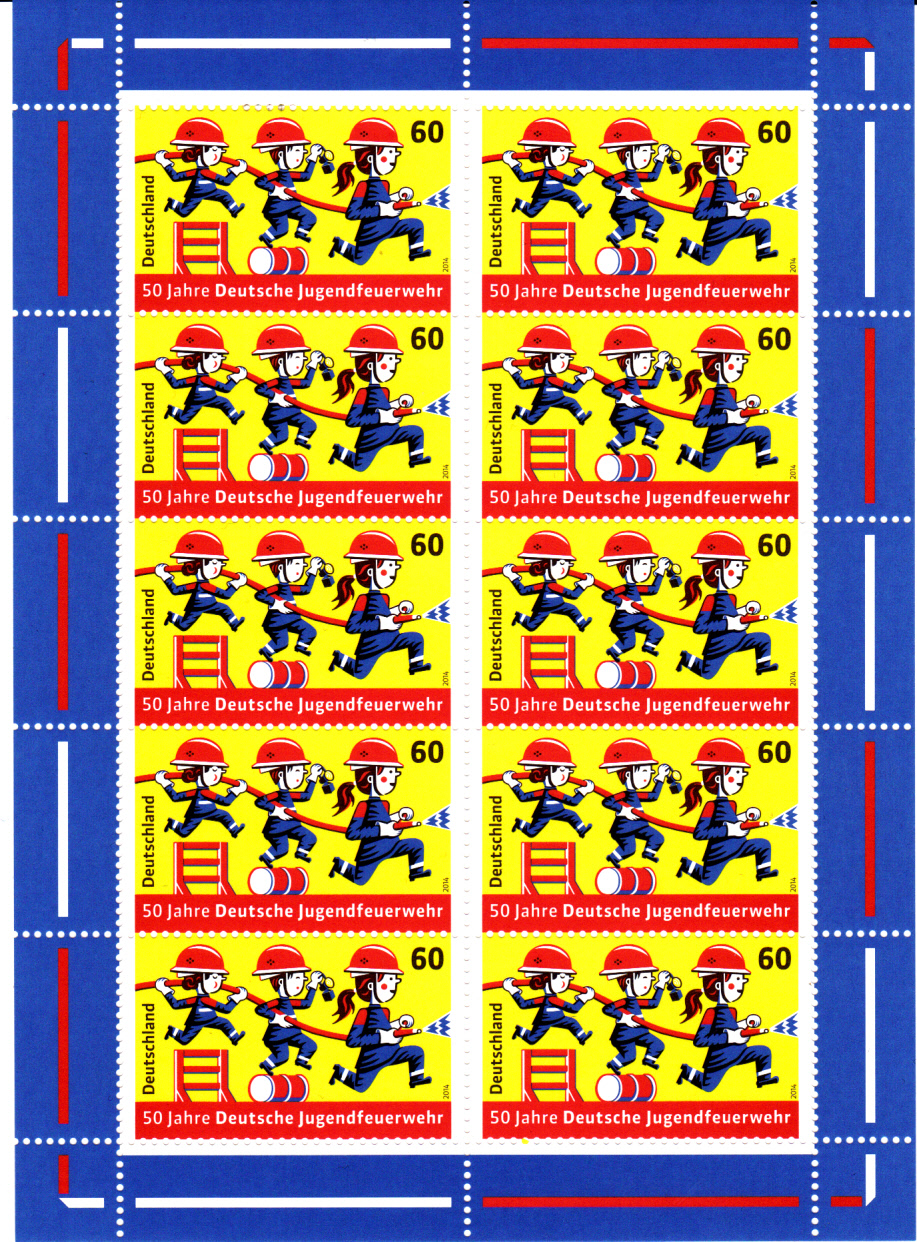 Am 7. August gab es bei der Deutschen Post eine Sondermarke (MiNr 3099) zu 50 Jahre Deutsche Jugendfeuerwehr. Auf der Marke wird die Feuerwehrausbildung bei Kindern dargestellt. Hier zeige ich den Kleinbogen mit 10 Marken.