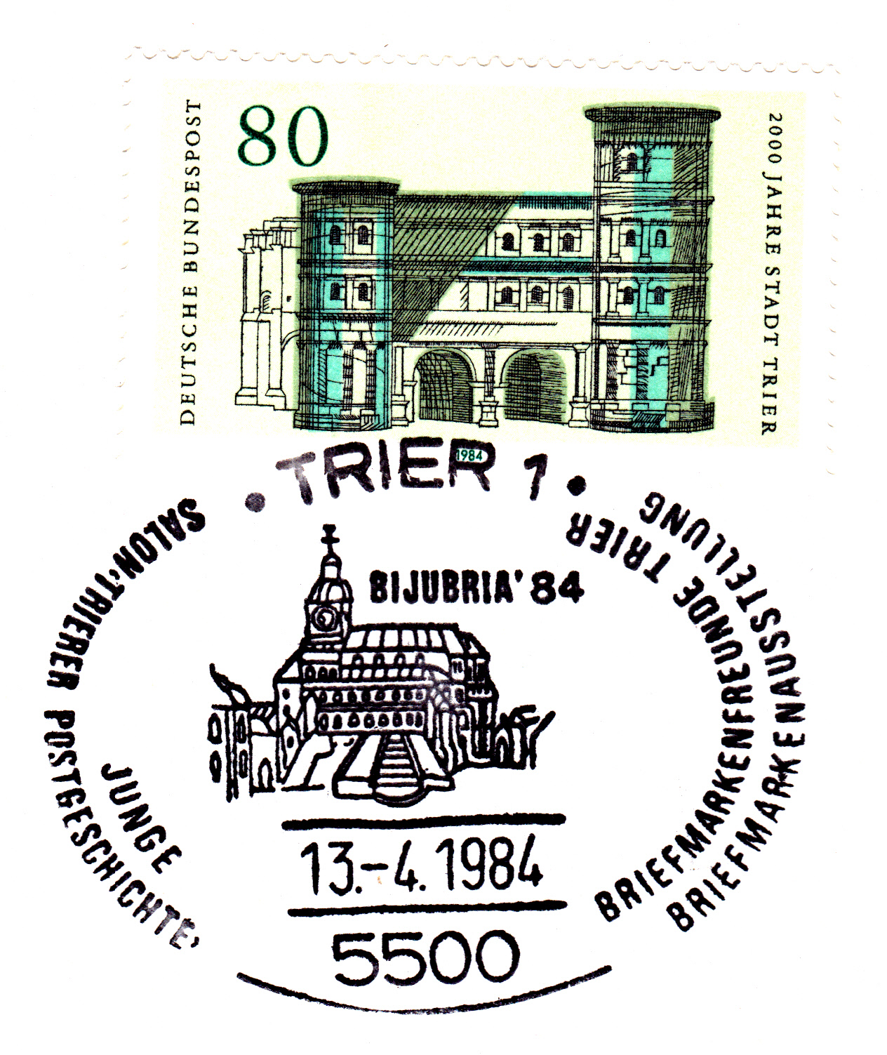Zur 2000-Jahrfeier der Stadt Trier erschien am 12.1.1984 bei der Deutschen Bundespost eine Sondermarke mit der Porta Nigra im Markenbild. Hier zeige ich ein Exemplar mit einem Sonderstempel aus Trier vom Ersttag. Im Stempelbild erscheint die Porta Nigra als Simeonskirche nach einem Stich von Caspar Merian aus dem Jahre 1670.