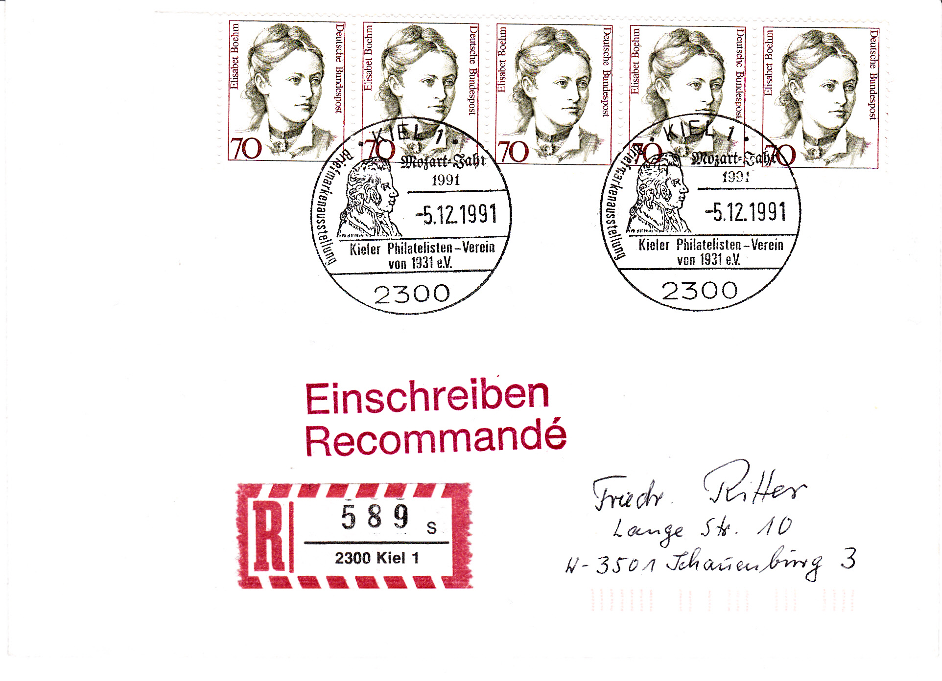 Fünferstreifen des 70 Pfennig-Wertes der DS Frauen (MiNr 1489) auf einem Einschreibebrief bis 20 g von Kiel nach Schauenburg. Das Porto betrug für den Brief bis 20 g 100 Pf und die Zusatzleistung Einschreiben 250 Pf, zusammen also wie verklebt 350 Pf.