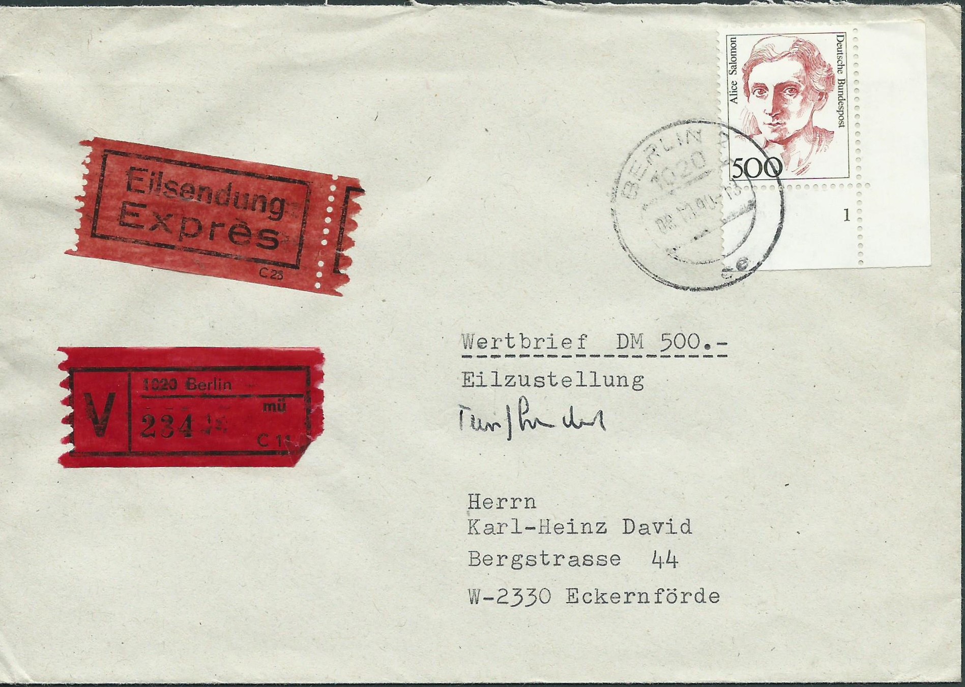 Und der letzte Beleg aus besagter Kiste ist ein Einschreiben mit 3 Marken Mi.Nr. 1365 Frauen 20 Pf und 2 Marken Mi.Nr. 1427 Frauen 1,80 DM, diese als waagerechtes Paar aus der rechten unteren Bogenecke mit Formnummer 2. Gestemoelt wurde die Frankatur in Erbach am 31.7.89. Schade nur, dass der Einschreibzettel eine Nummer zu niedrig ist, sonst hätte er gut zum Kinostart des neuen James Bond-Films gepasst. Aber der heisst ja bekanntlich 007 und nicht 006 :D ;)