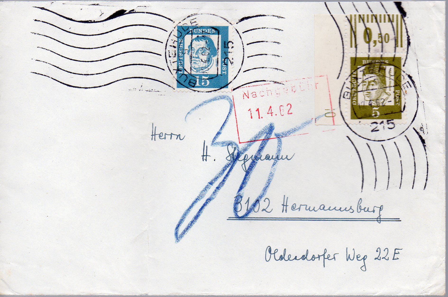 Einheiten der Dauerserie wurden meist von Sammlern verklebt, hier einmal ein Bedarfsbrief aus Bielefeld mit Nachgebühr, da das Sendungsgewicht über 20 g betrug.