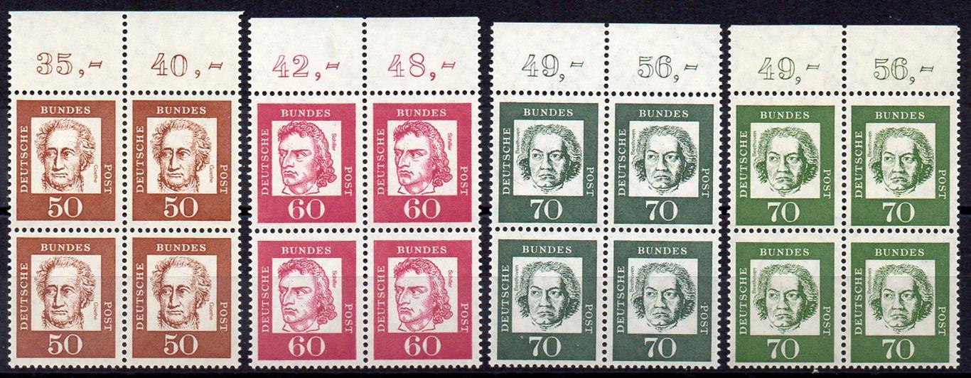 Zwar wurden 16 verschiedene Werte herausgegeben, handelsüblich gehören jedoch die 2 unterschiedlichen Farben der Werte zu 5 (bräunlicholiv erschien erst 1965 nur im Markenheftchen / -bogen) und 70 Pfg. (die schwarzblaugrüne erschien im November 1962) zum Satz.