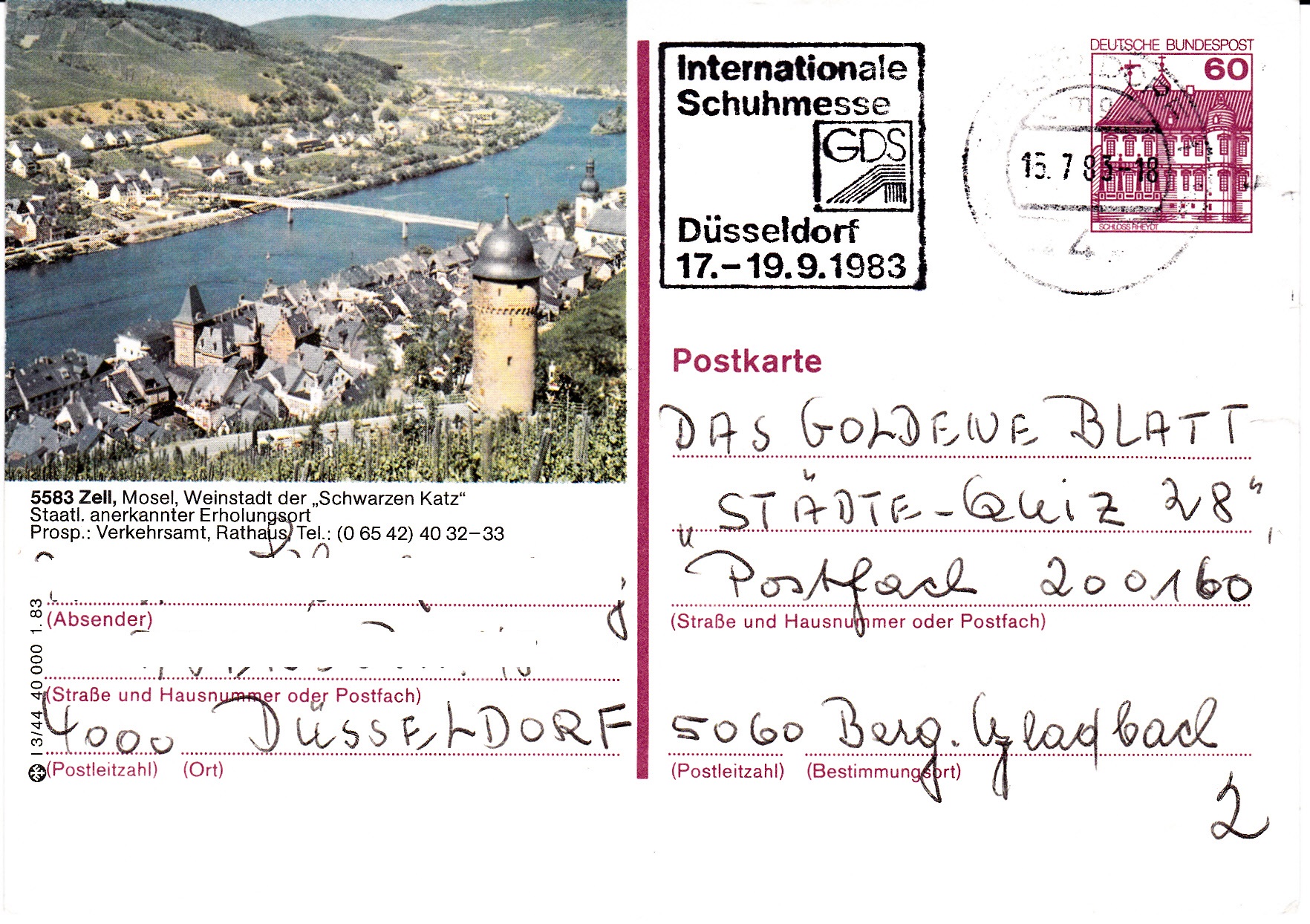 Eine weitere Bildpostkarte MICHEL P 138 mit Werbung für den Weinort Zell an der Mosel. Im Text wird der Name des bekannten Weines "Zeller Schwarze Katz" genannt. Die Karte zeigt Weinberge bei Zell. Sie erschien in der Teilserie = Auflage "l" (1983).
