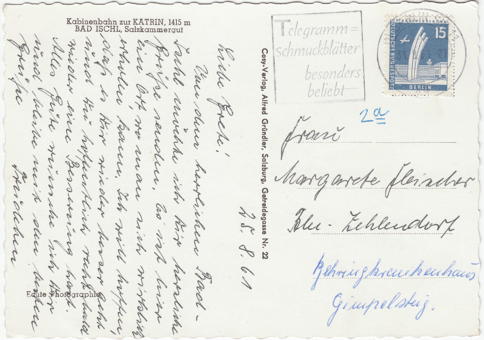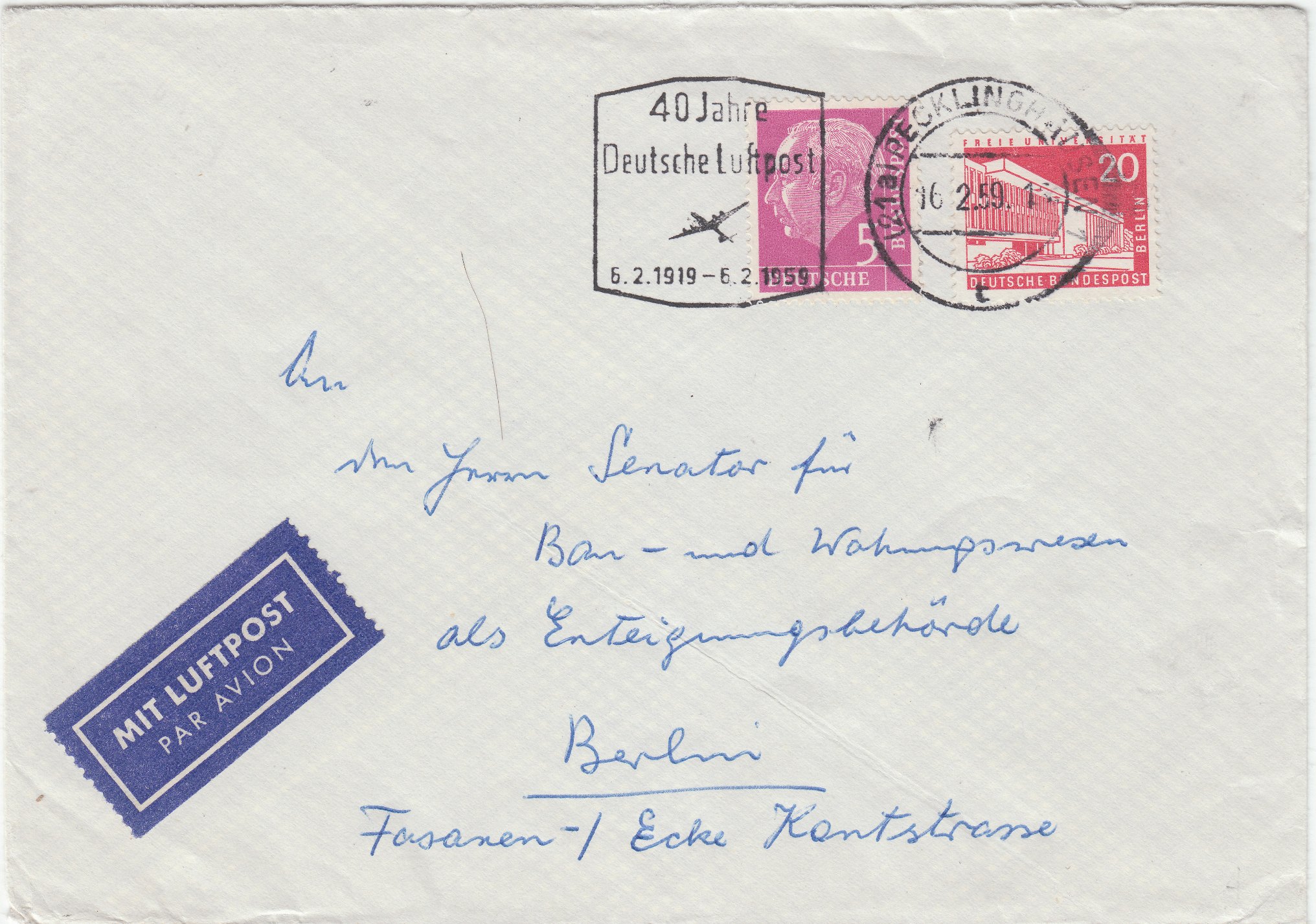Der Brief wurde am 16.02.1959 frankiert mit einem 5 Pf-Wert Heuss I sowie einem 20 Pf-Wert Freimarke Berliner Stadtbilder: