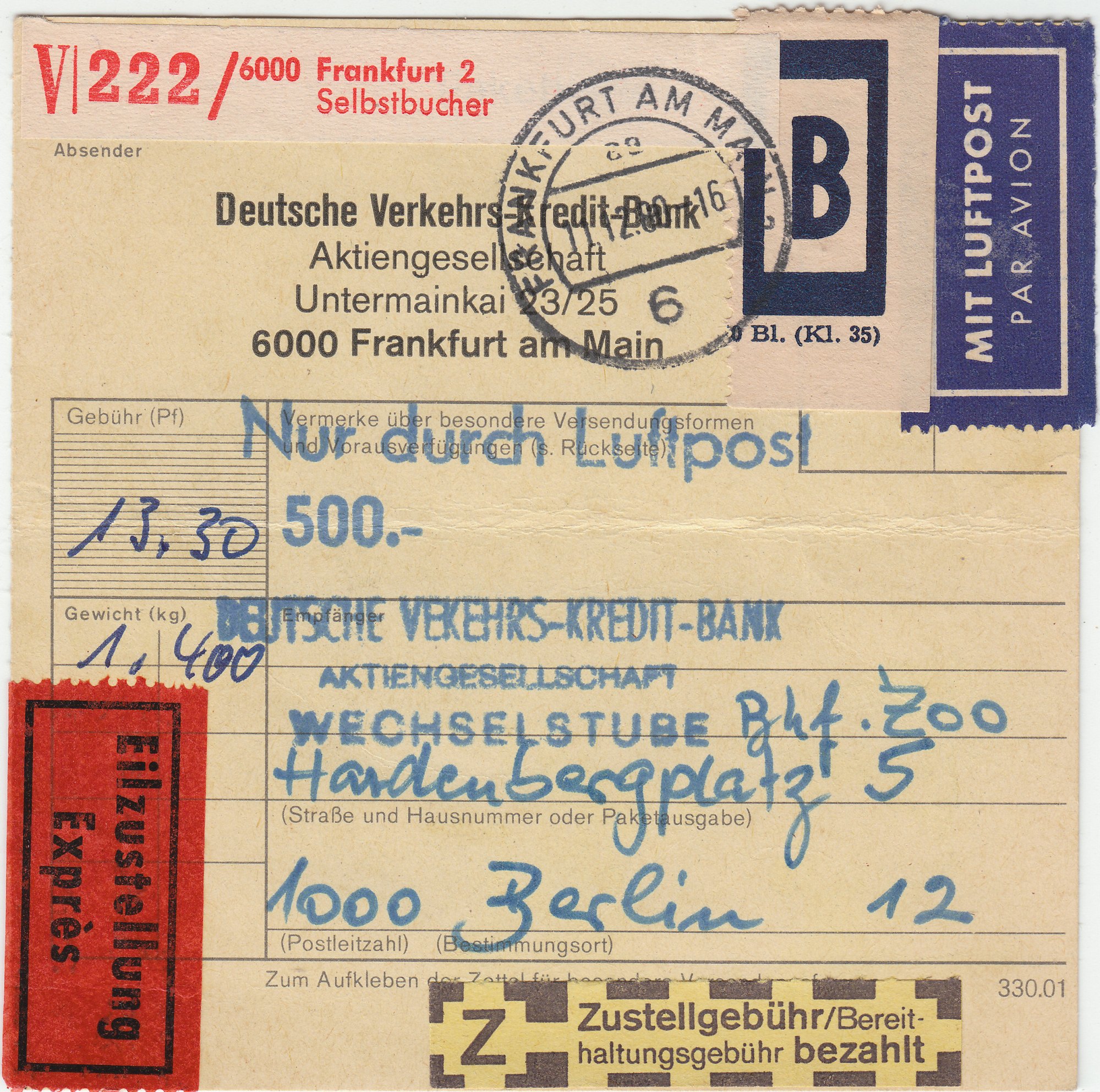 Standardbrief bis 20 g im Fernverkehr, Porto 20 Pf, per Luftpost, Luftpostgebühr 5 Pf, mit 25 Pf demnach portogerecht freigemacht, gelaufen von Recklinghausen nach Berlin, per Luftpost also von Düsseldorf bis Berlin.