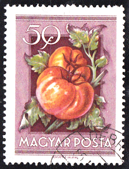 Diese Marke aus Ungarn (MiNr 1388) aus dem gleichen Satz wie die vorhergehende Marke zeigt Tomaten (Lycopersicon esculentum) am Strauch.
