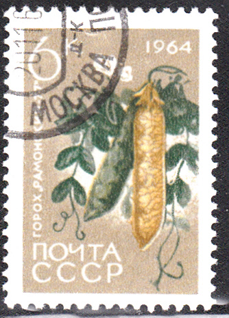 In der Sowjetunion gab es 1964 diese Marke (MiNr 2925 A) mit der Abbildung von Erbsenschoten an einer Pflanze. Die Marke gibt es auch geschnitten (MiNr 2925 B).