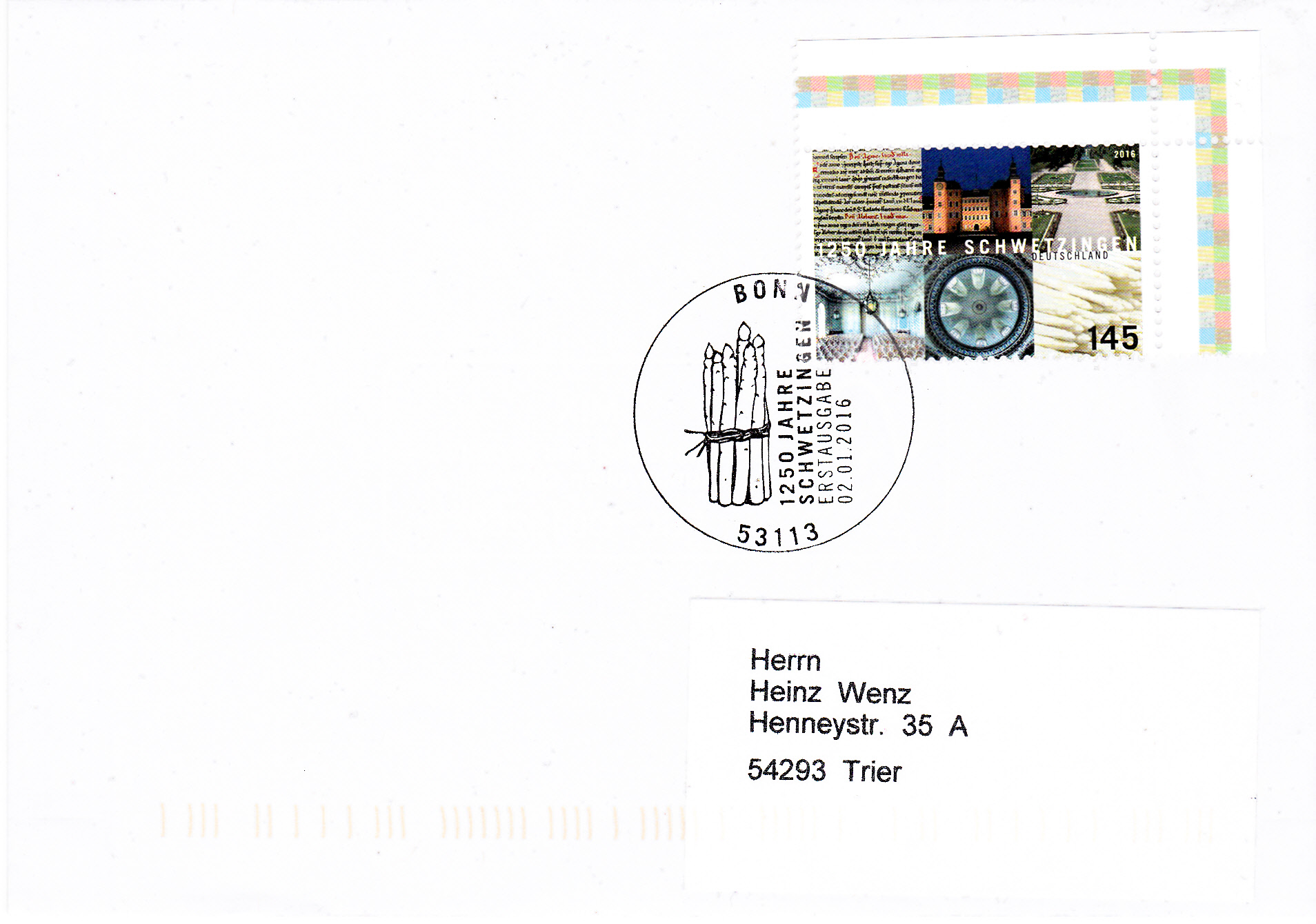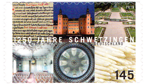Schwetzingen ist eine Stadt im Nordwesten Baden-Württembergs, etwa 10 Kilometer westlich von Heidelberg und 15 Kilometer südöstlich von Mannheim. Der Spargelanbau ist für Schwetzingen von großer Bedeutung. Da ist es nicht verwunderlich, dass im Markenbild der Sondermarke der Deutschen Post (MiNr 3204) neben dem Lorscher Codex, dem Schloss Schwetzingen und dem Schlossgarten, dem Mozartsaal und der Kuppel der Gartenmoschee auch Spargelstangen abgebildet sind.