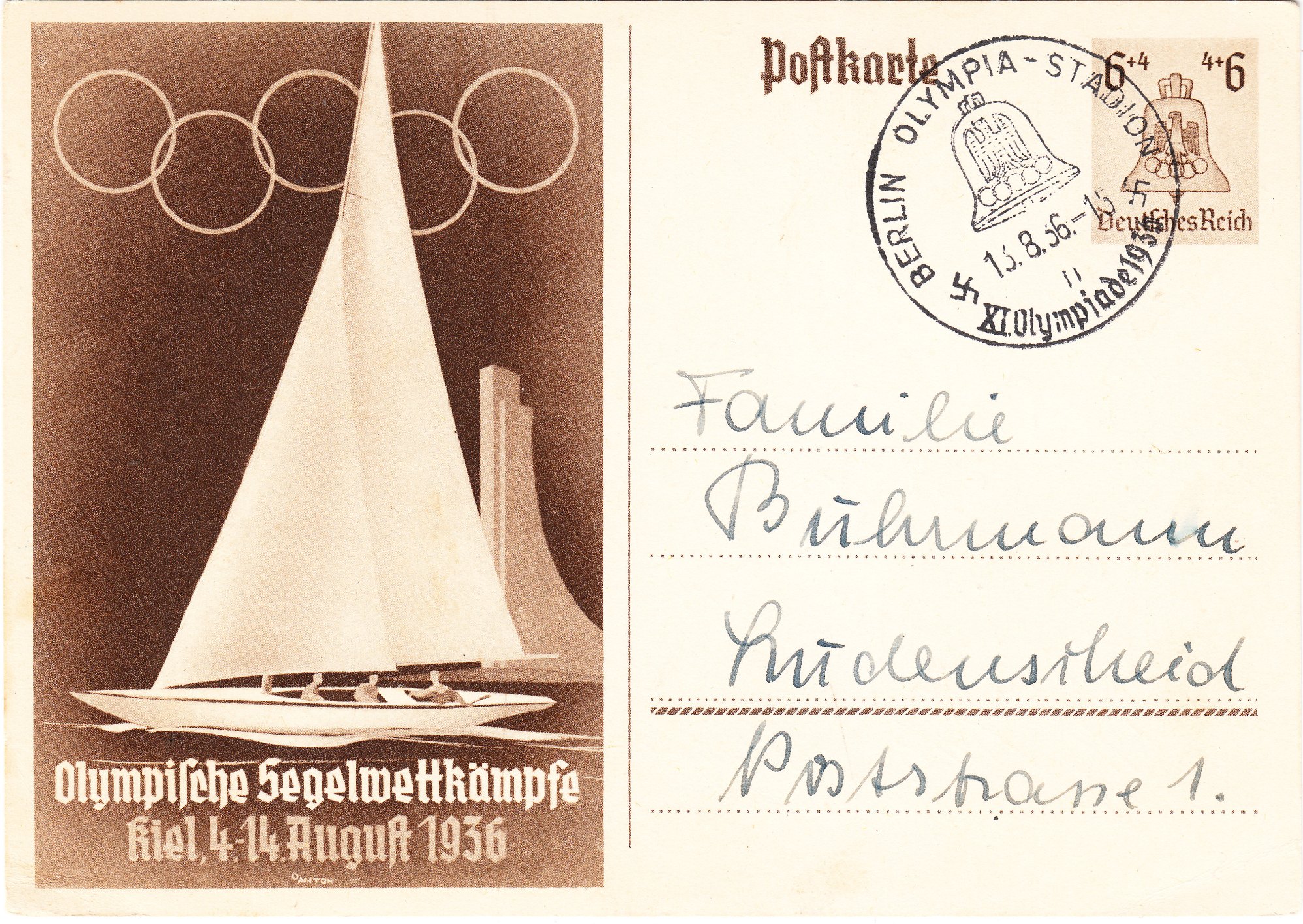 Fernpostkarte, am 10.08.1936 portorichtig freigemacht mit 6 Pfennig, um 23 Uhr gestempelt "BERLIN OLYMPIA STADION" ohne Kennbuchstabe: