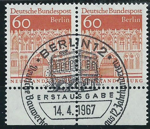 Gefolgt von einem waagerechten Paar vom Unterrand der Wertstufe 60 Pf mit Ersttagsstempel von Berlin 12 vom 14.4.67: