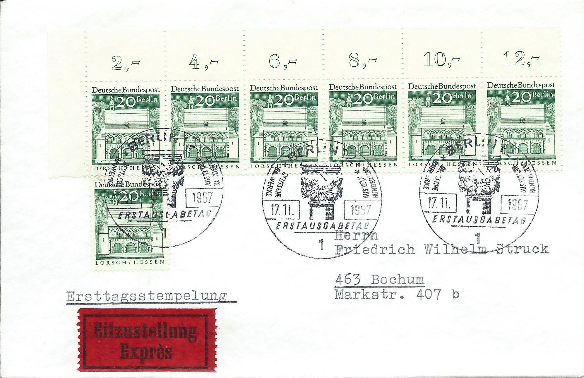 Dann folgt ein waagerechter 6-er-Streifen nebst einer Einzelmarke der 20 Pf-Marke auf einem Eilbrief mit Berliner Ersttagsstempel. Leider sind da 10 Pf zu viel verklebt, die Gebühr hätte 30 Pf für den Brief und 1 DM für die Eilzustellung betragen.